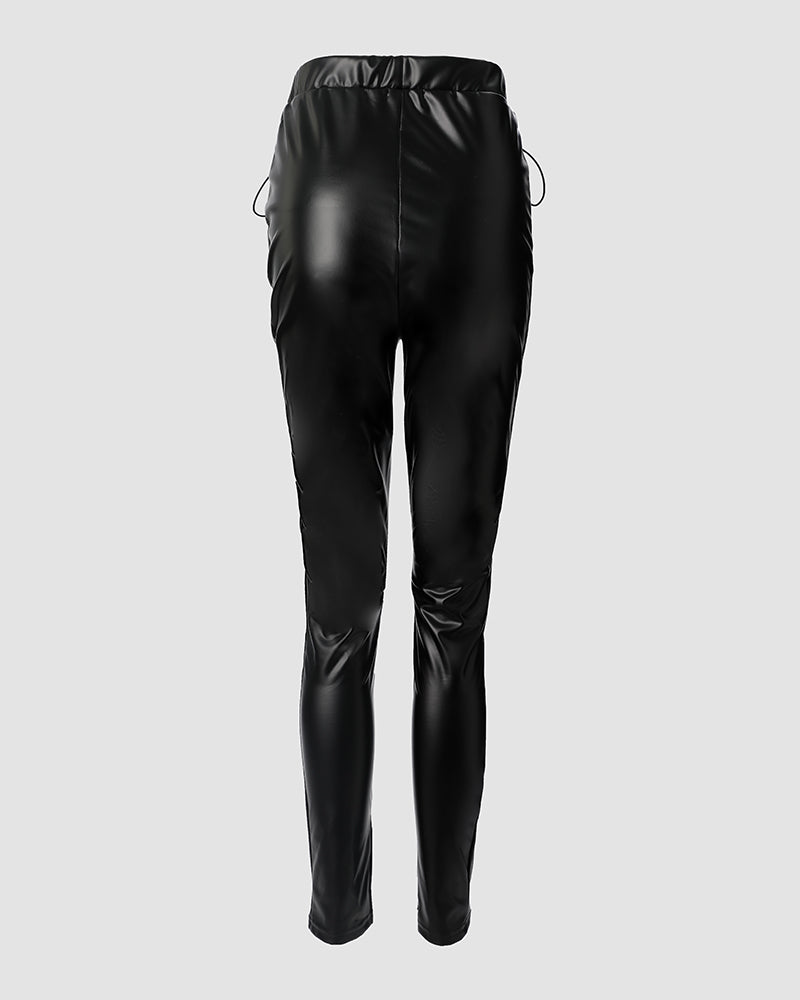 PU Leather Wrap Lace Up Casual Mid Length Skirt Work Skirt