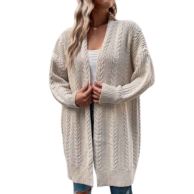 Open Front Long Sleeve Cinched Waist Kint Jacquard Coat