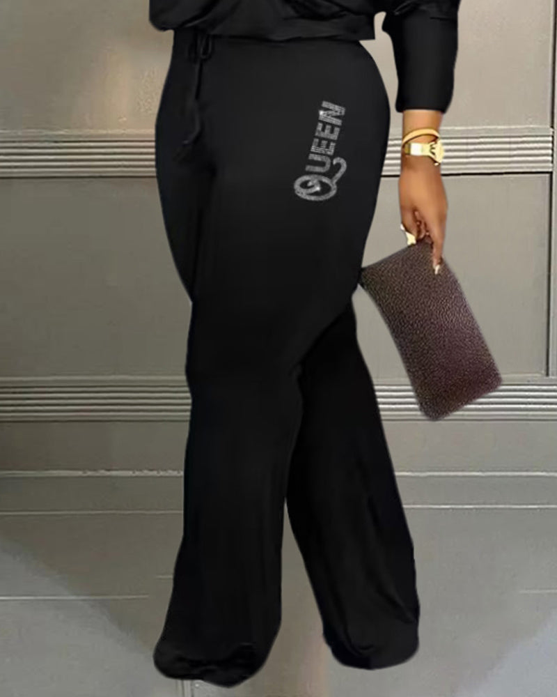 Plus Size Rhinestone Birthday Queen Crown Pattern Top & Flared Pants Set