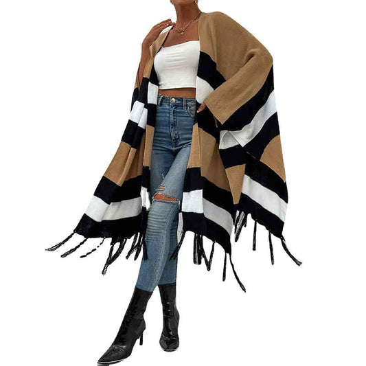 Womens-Cardigans-Open-Front-Color-Stripe-Slash-Tassel-Hem-Poncho-Knit-Sweater-K289