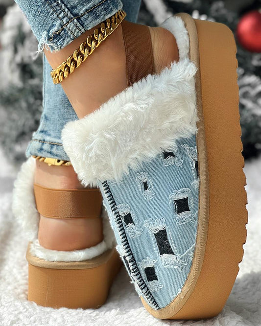 Colorblock Fuzzy Lined Platform Ripped Slippers