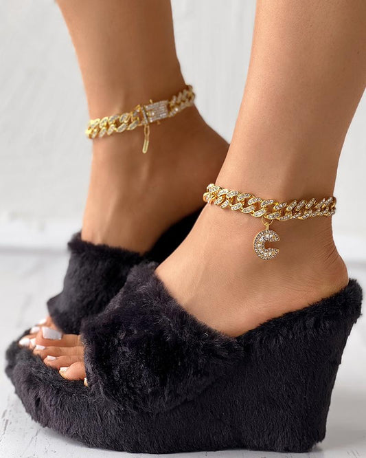 One Strap Fuzzy Wedge Slippers