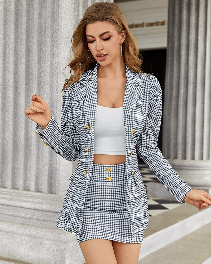 2 Pieces Outfit Plaid Print Open Front Contrast Paneled Multi Zipper Decor Crop Coat and High Waist Slim Fit Skirt Set