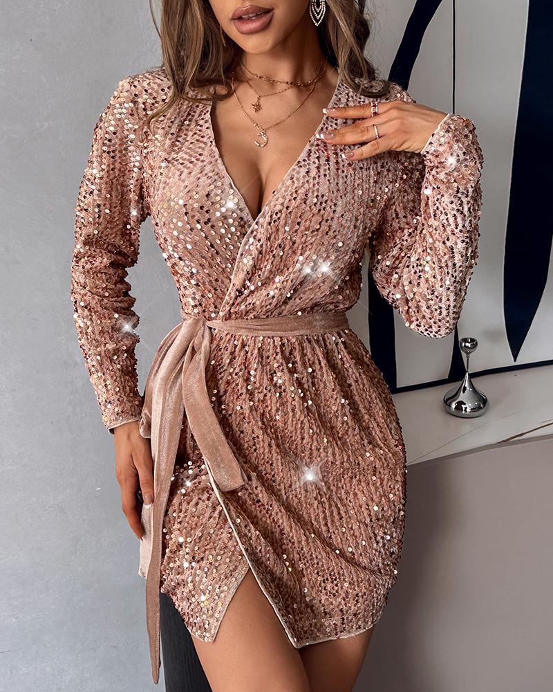 Pitaya Pink Velvet Sequin Long Sleeve V Neck Wrapped Mini Dress