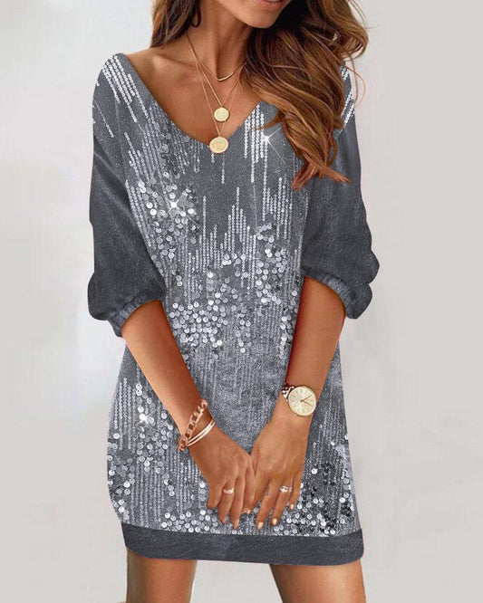 Contrast Sequin Velvet V Neck Casual Dress
