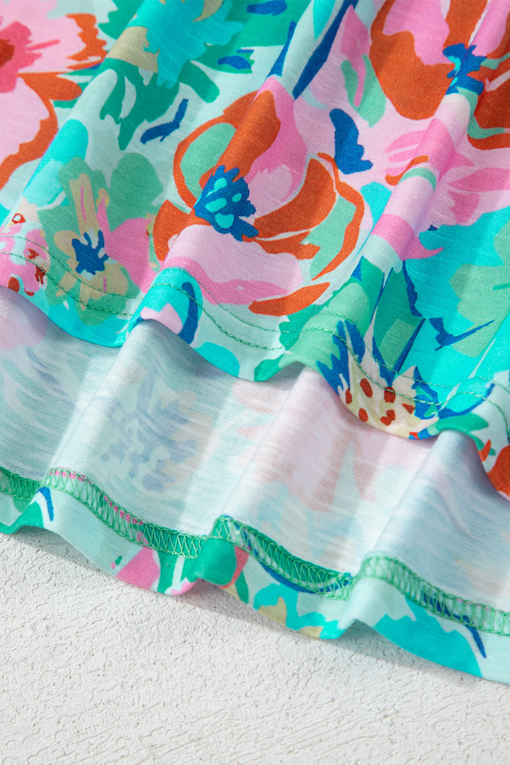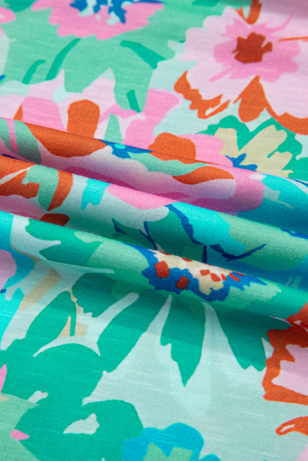 Green Floral Print Eyelet Embroidered Short Sleeve Crew Neck Top