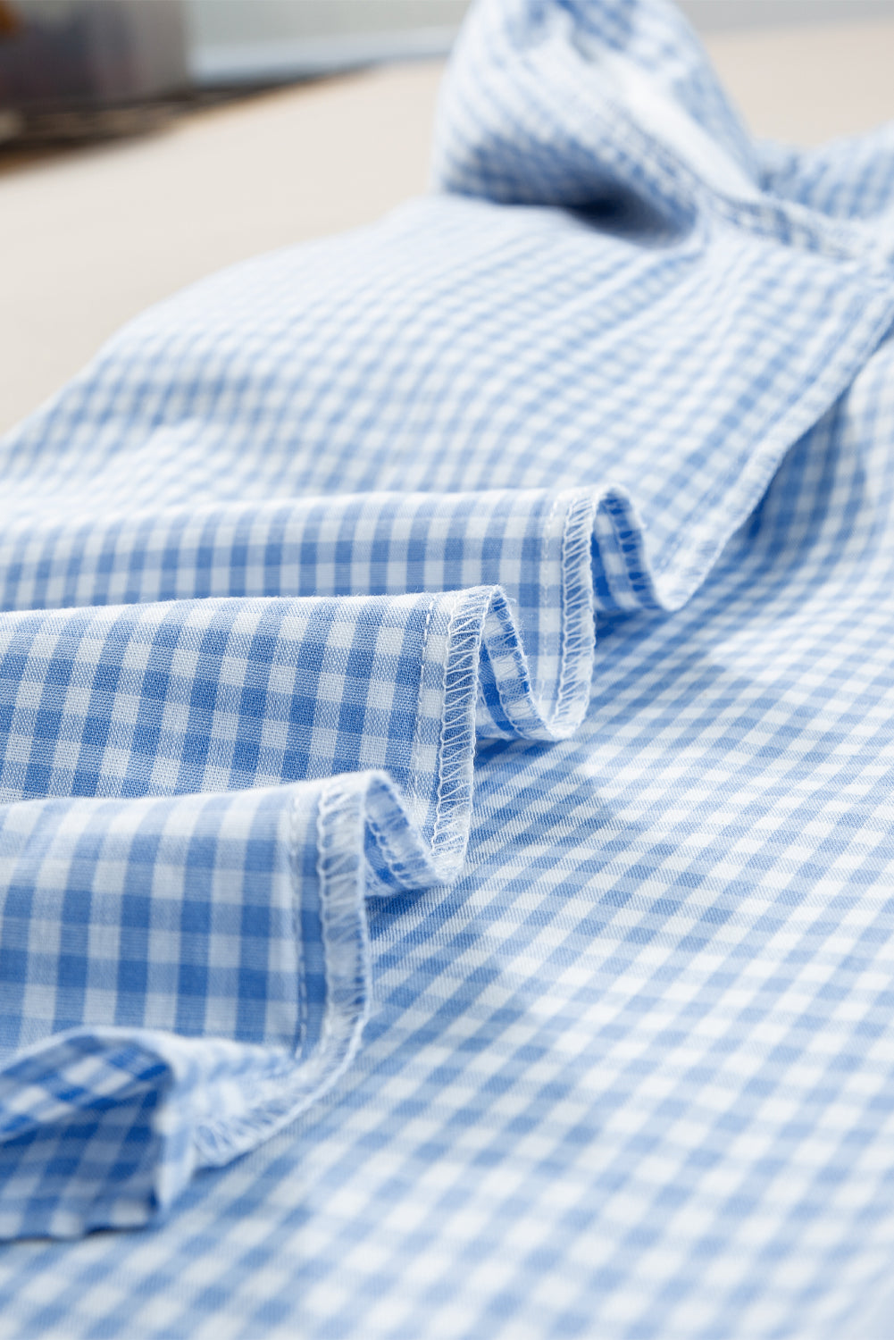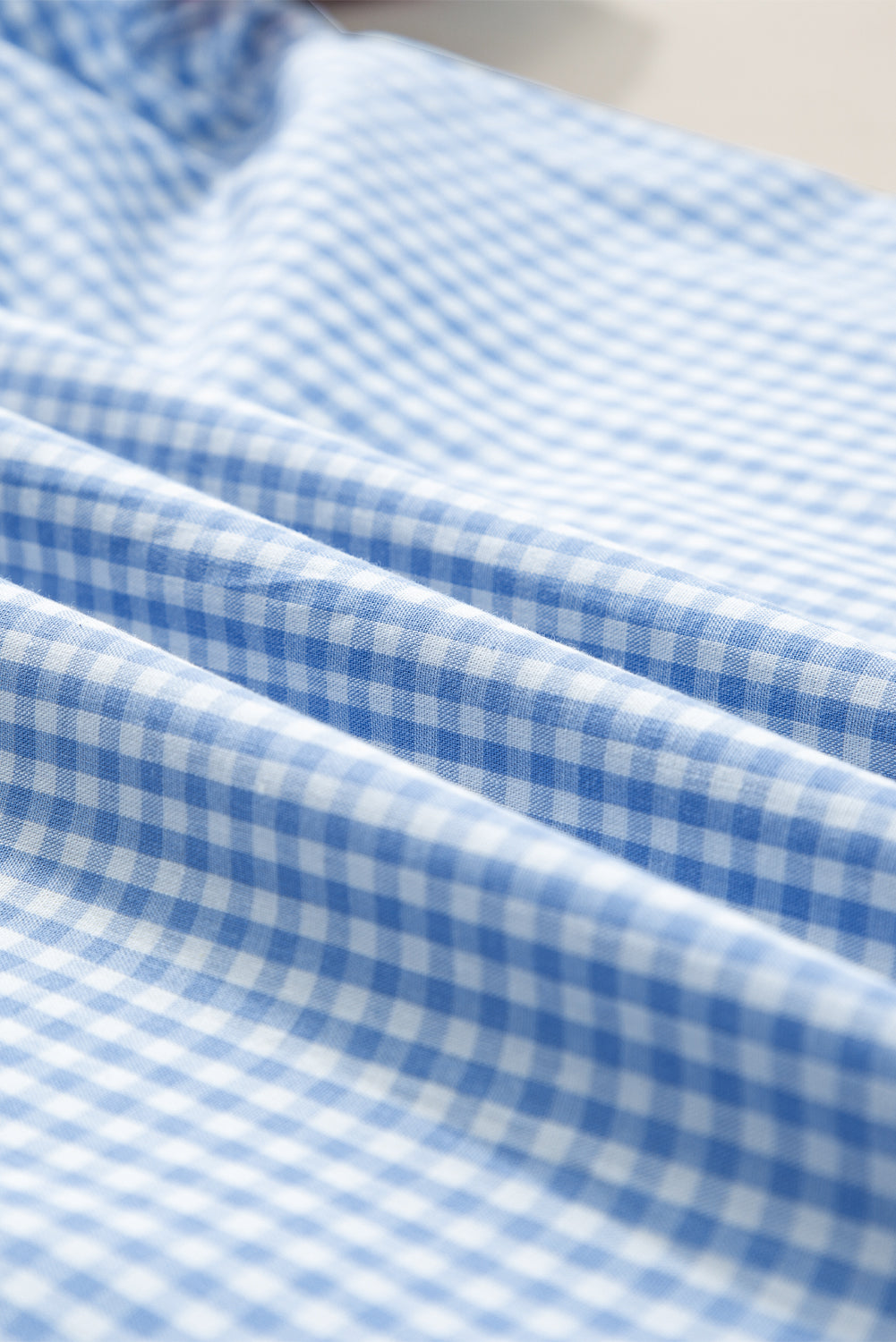 Light Blue Gingham Floral Embroidered Puff Sleeve Blouse