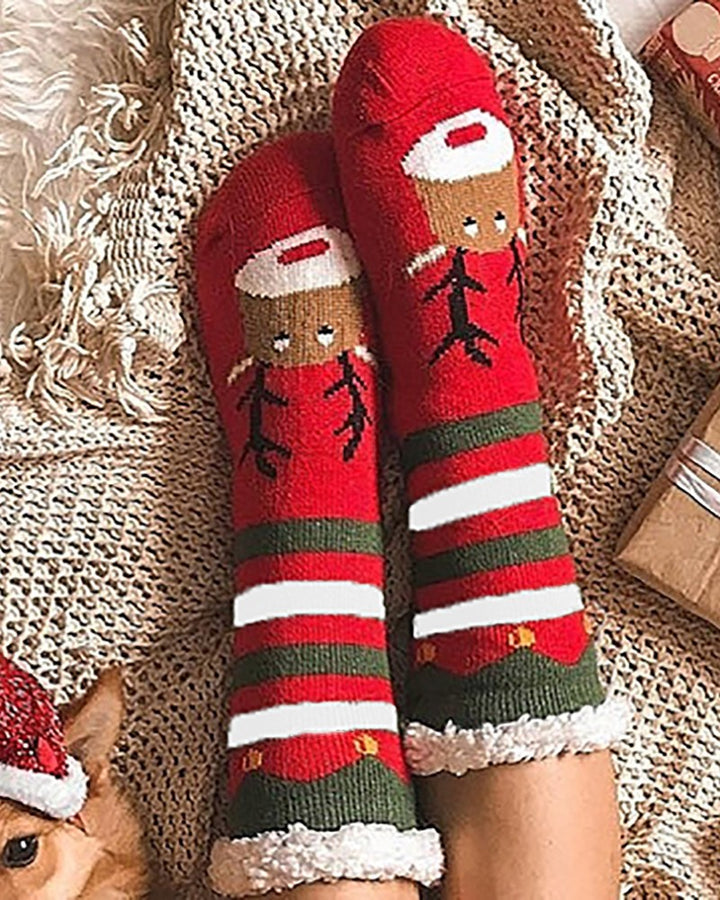 1Pair Christmas Elk Print Striped Fluffy Socks