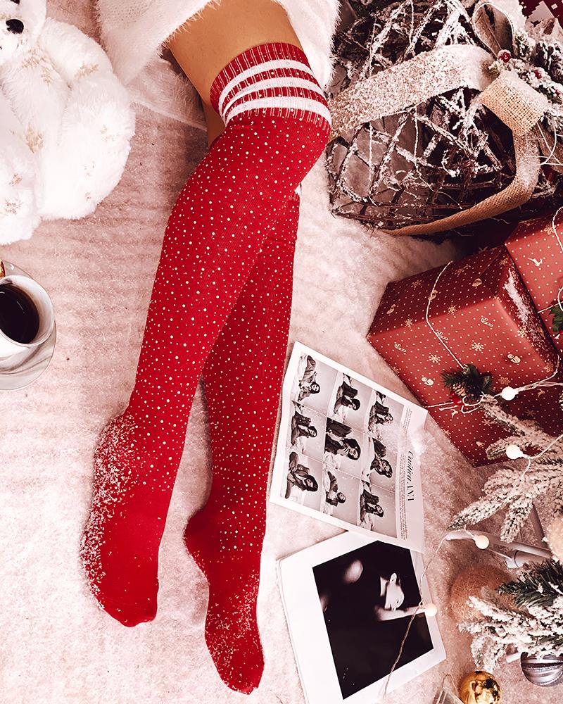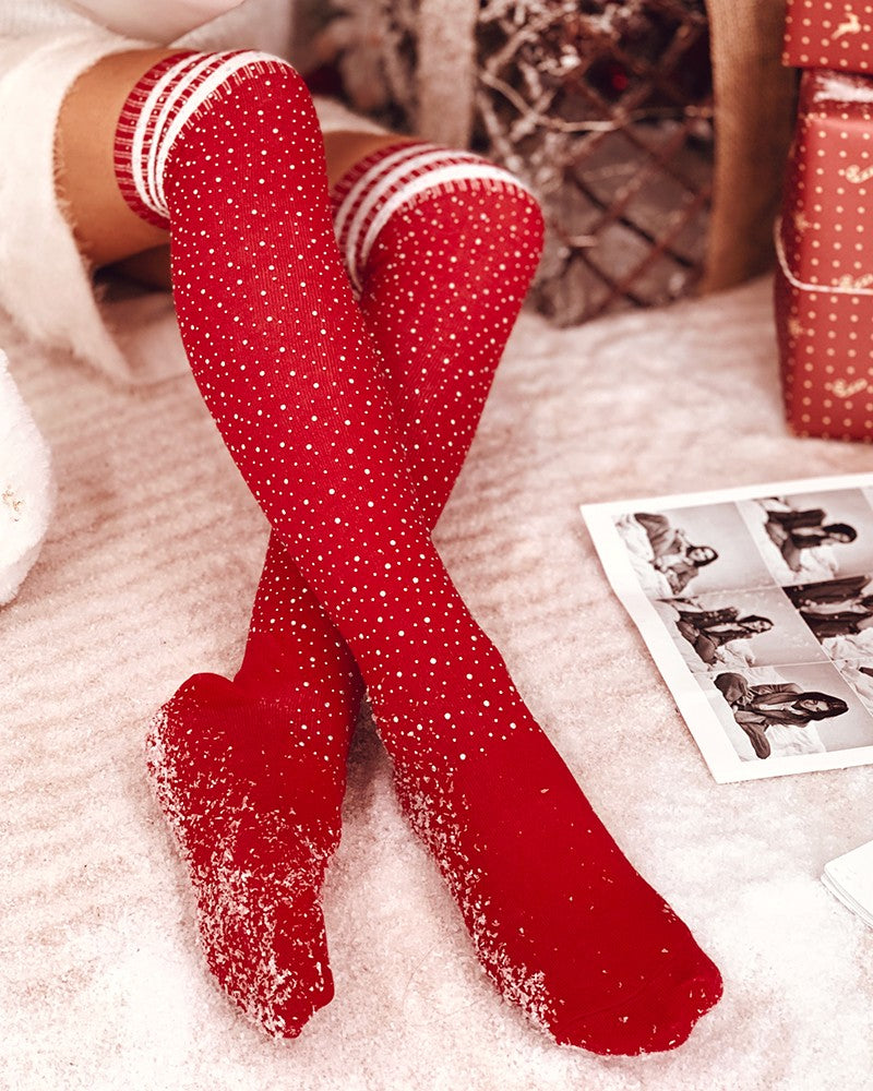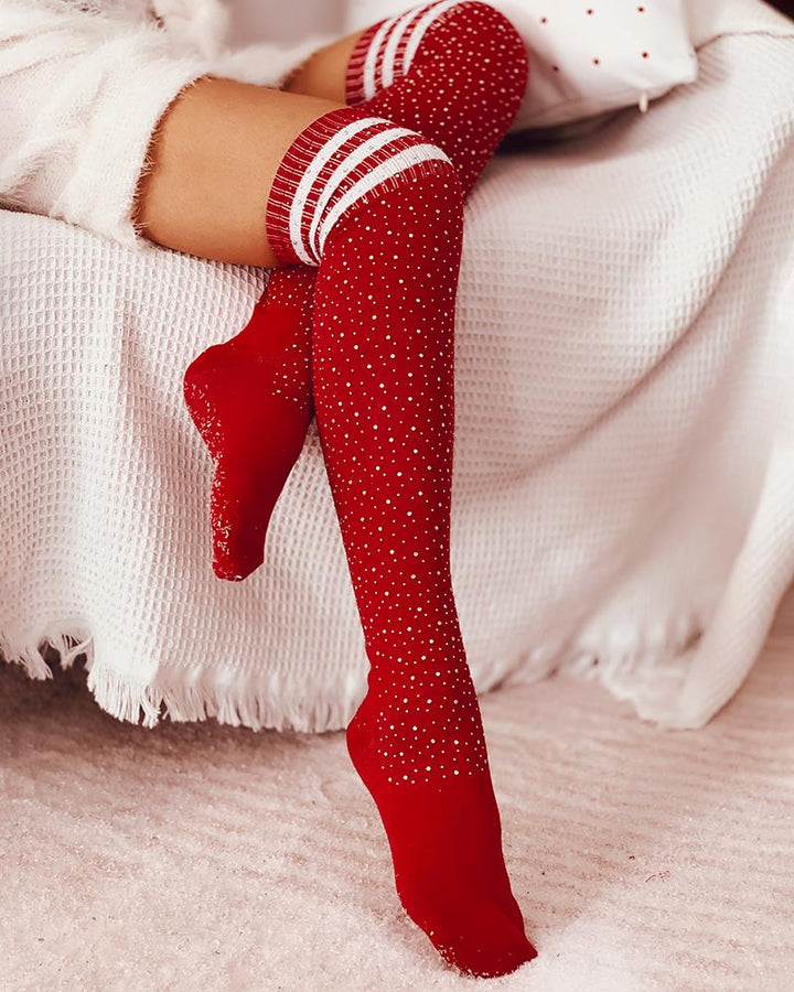 1Pair Christmas Striped Print Rhinestone Decor Long Socks