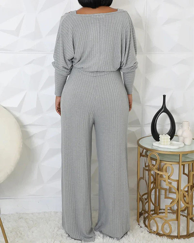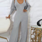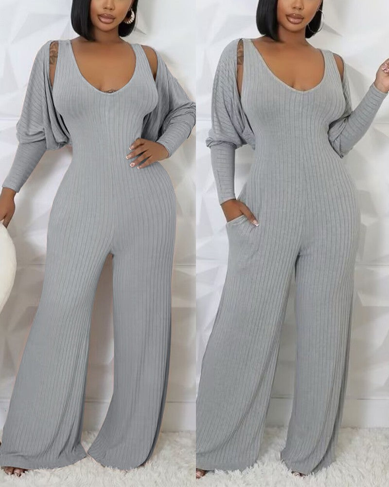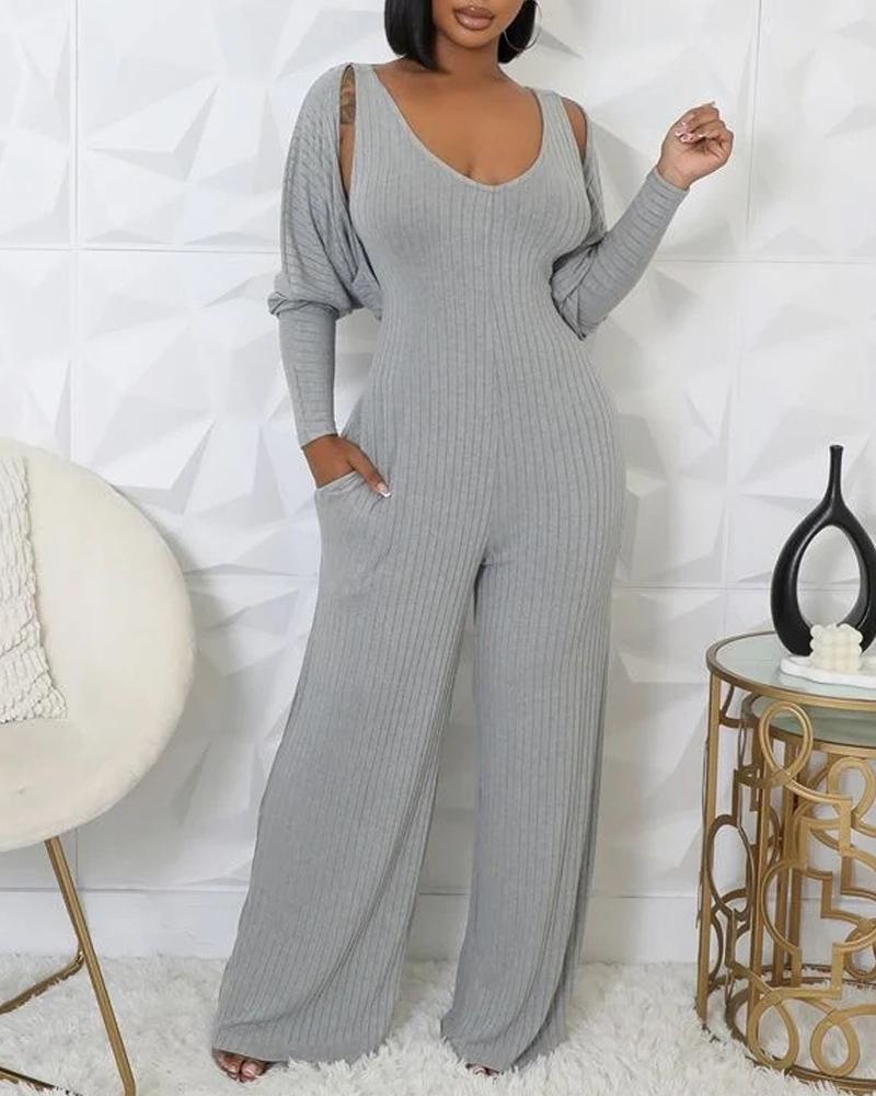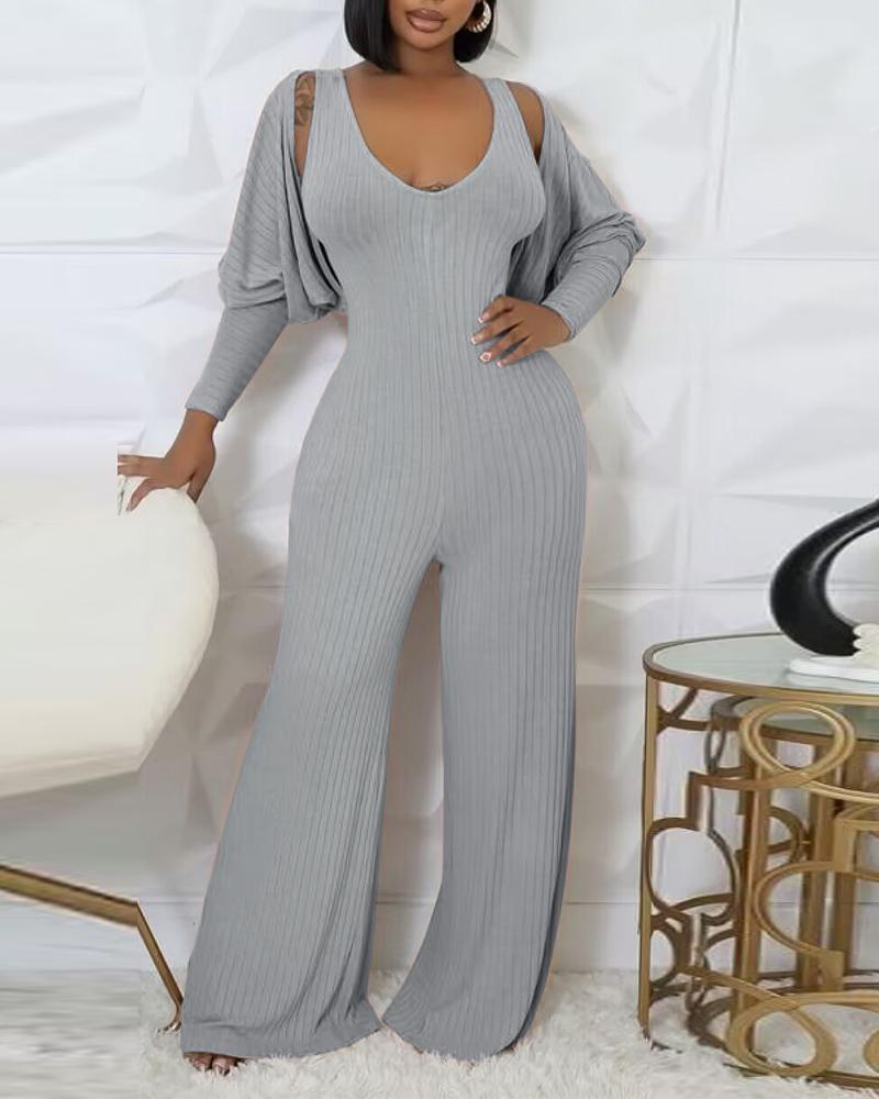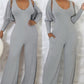 2 Piece V Neck Sleeveless Wide Leg Jumpsuit with Pockets Gigot Sleeve Open Front Coat Outfits Set