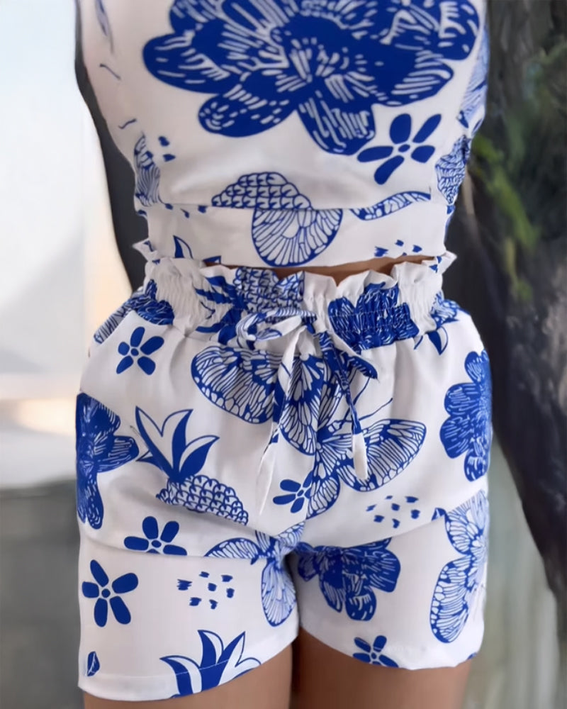 2 Pieces Outfit Floral Print Halter Backless Tied Detail Tank and Fruit Print Shirred Drawstring Shorts Set