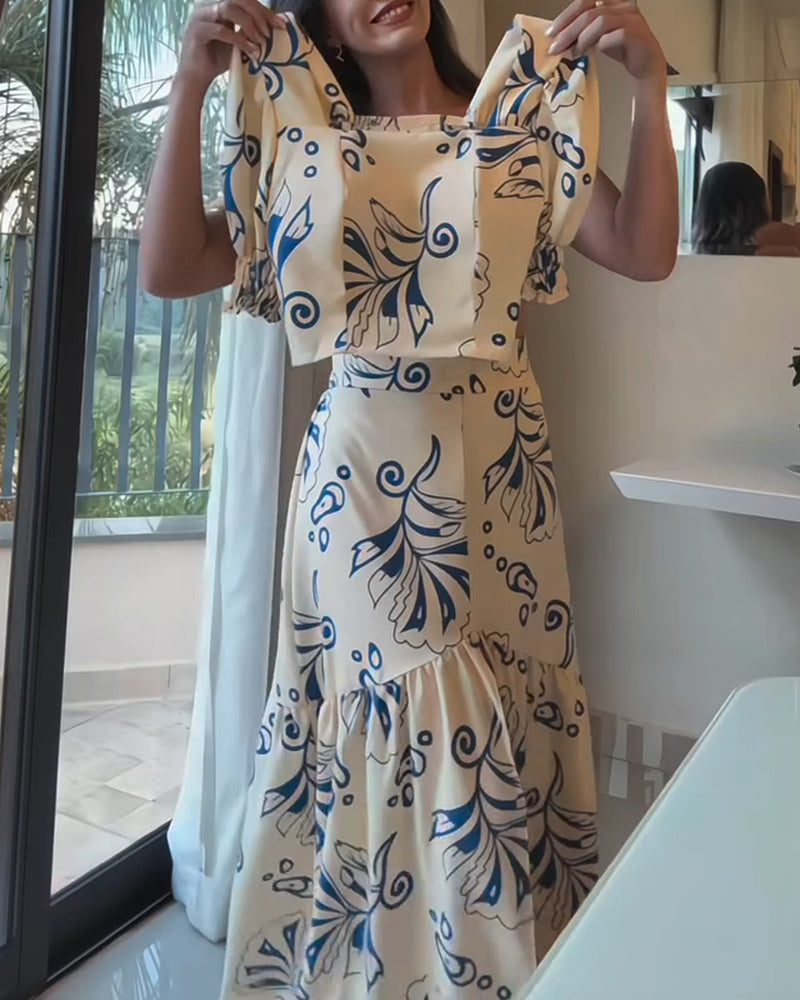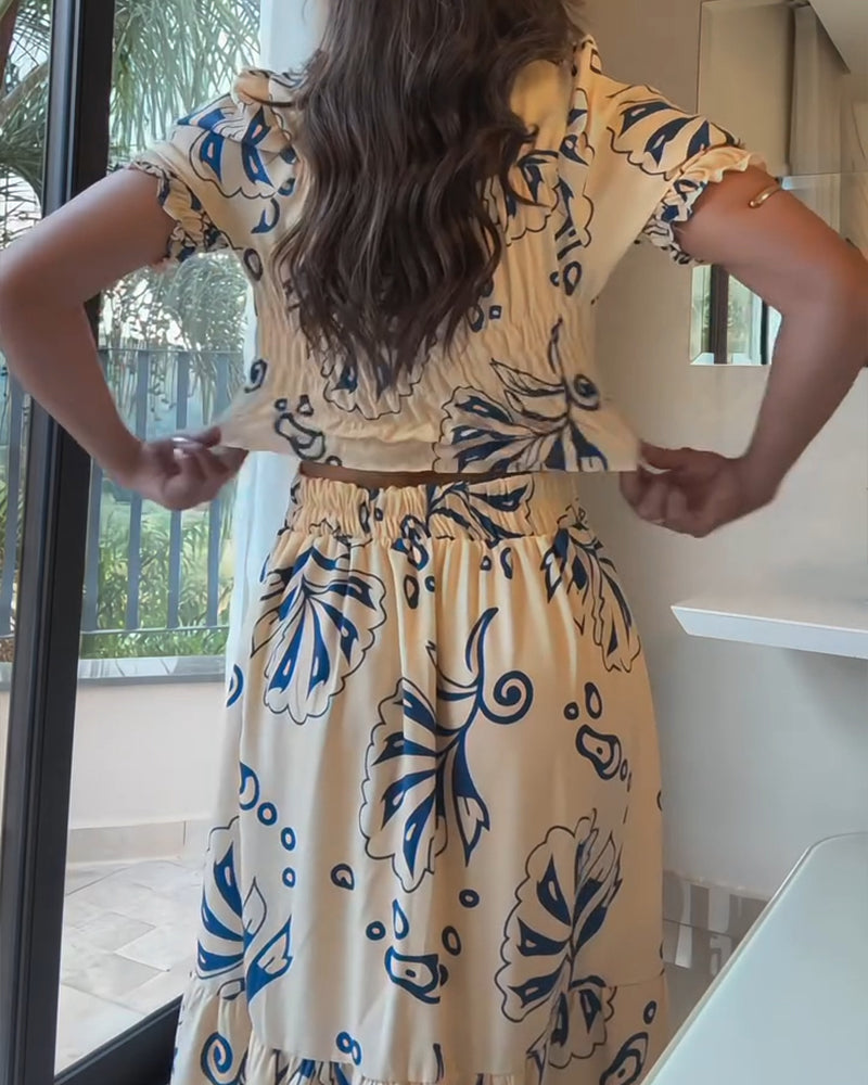 2 Pieces Outfit Floral Print Square Neck Puff Sleeve Crop Top and Casual A Line Ruffles Skirt Set