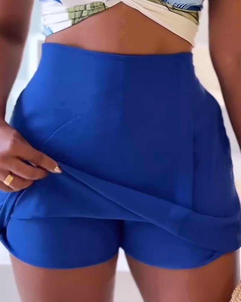 2 Pieces Outfit Floral Print Twist Tied Detail Top and Plain Slim Fit Skirt with Shorts Set