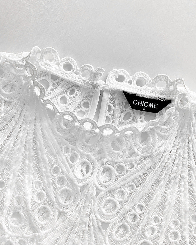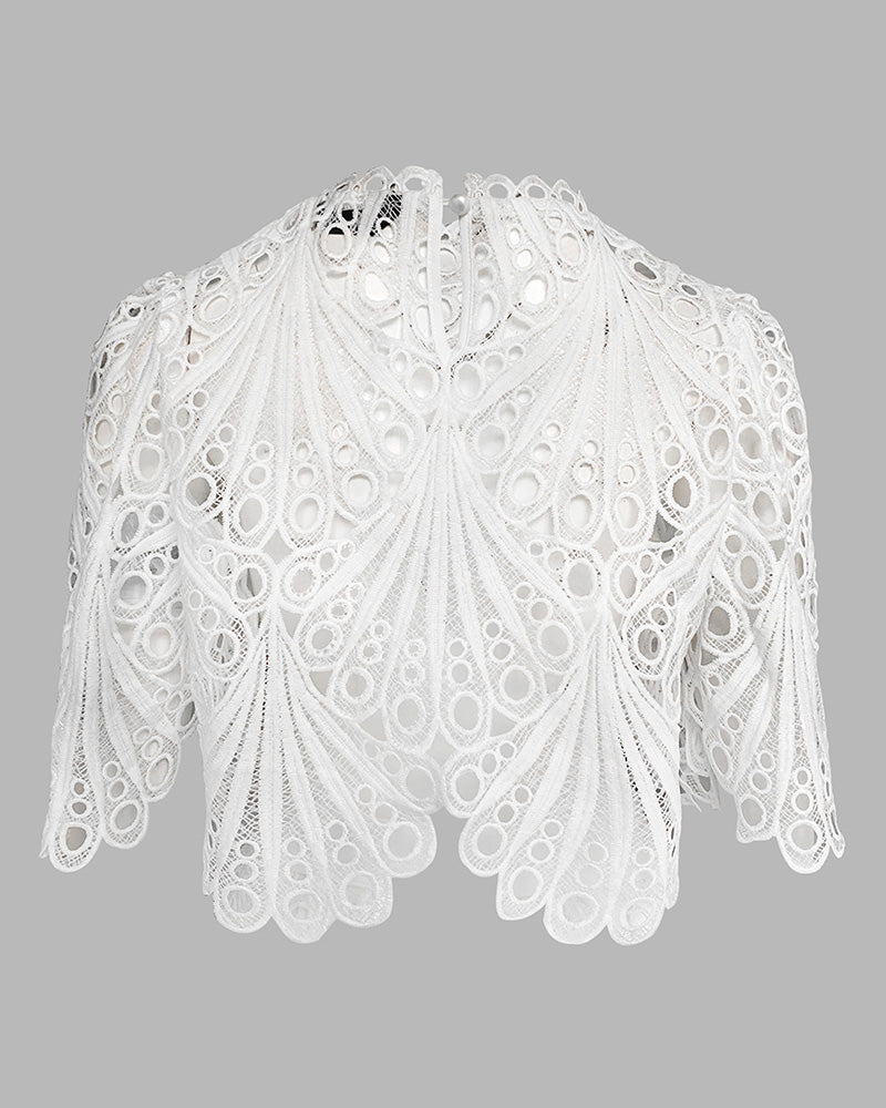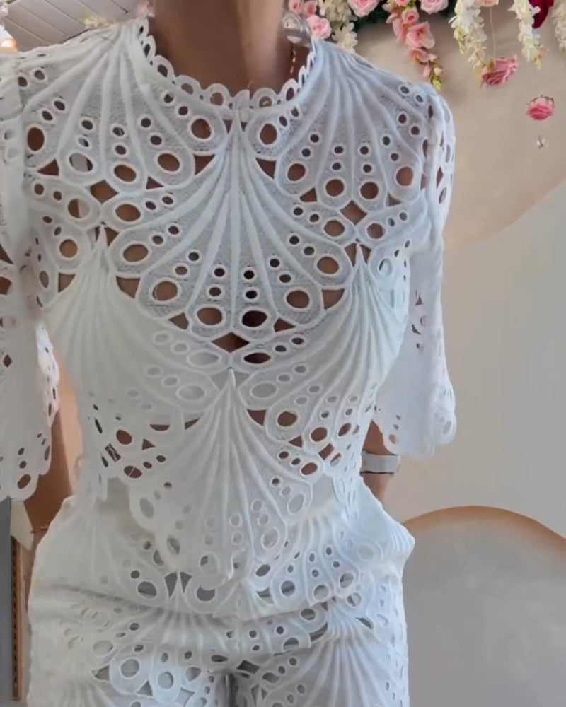 2 Pieces Outfit Lace Hollow Out Bell Sleeve Crop Top and Casual Slim Fit Straight Leg Pants Set