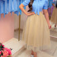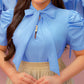 2 Pieces Outfit Puff Sleeve Tie Neck Bowknot Blouse and Casual High Waist Sheer Mesh Skirt Set