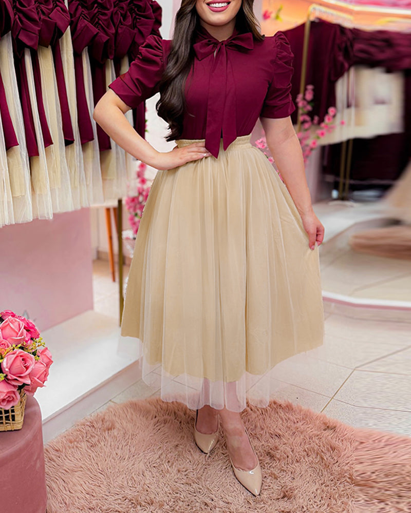 2 Pieces Outfit Puff Sleeve Tie Neck Bowknot Decor Blouse and Casual High Waist Sheer Mesh Skirt Set