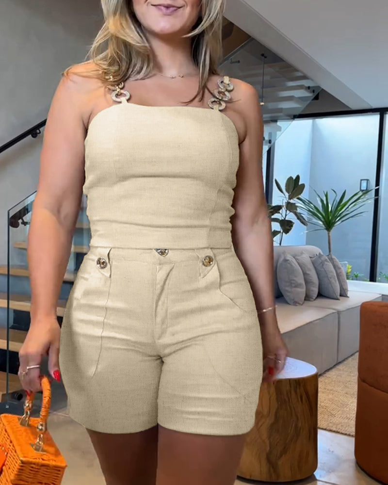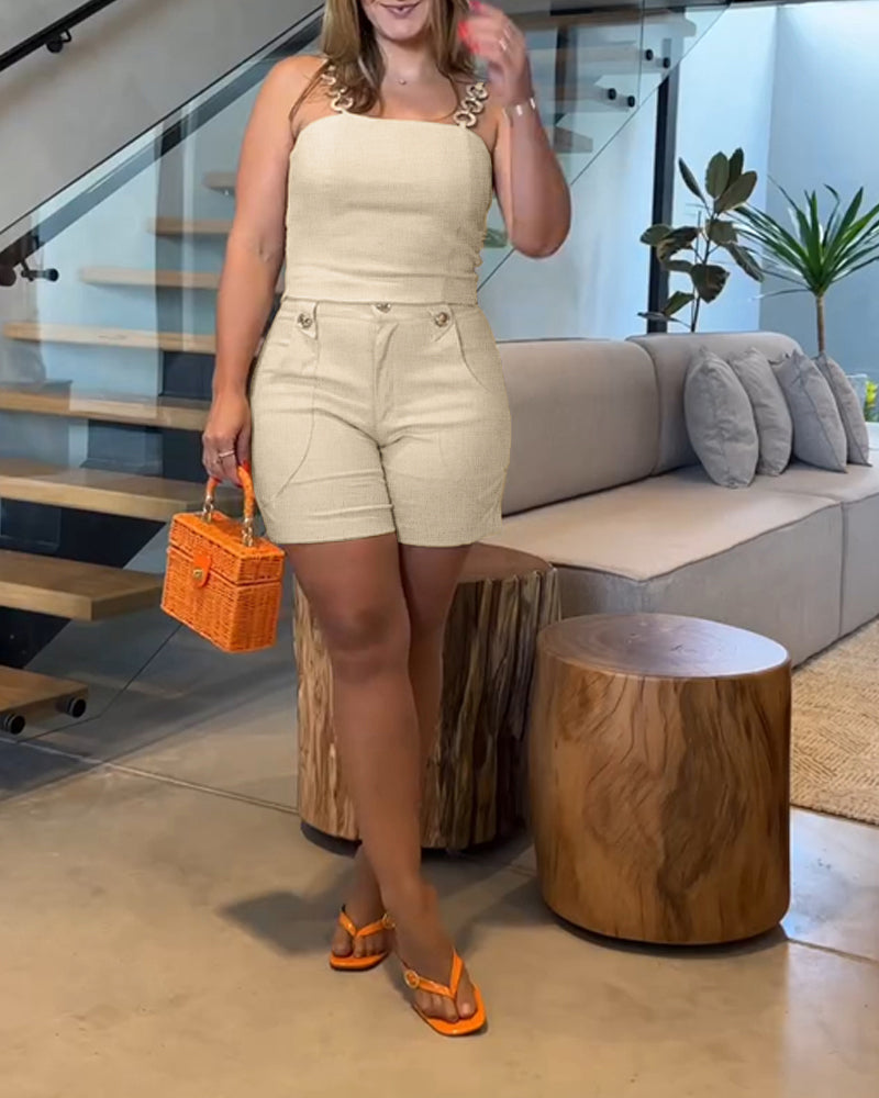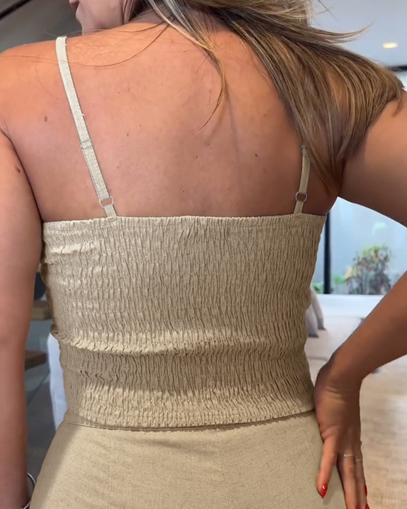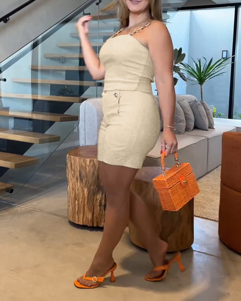 2 Pieces Outfit Shoulder Strap Shirred Sim Fit Tank and Pocket Design Skinny Shorts Set