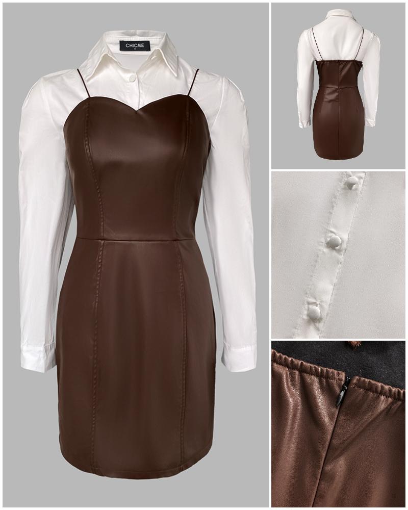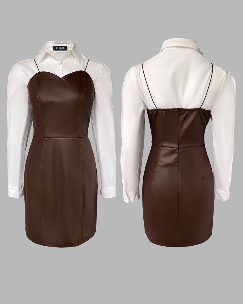 2 Pieces Outfit Turn down Collar Long Sleeve Blouses and Casual Spaghetti Straps PU Leather Skirt
