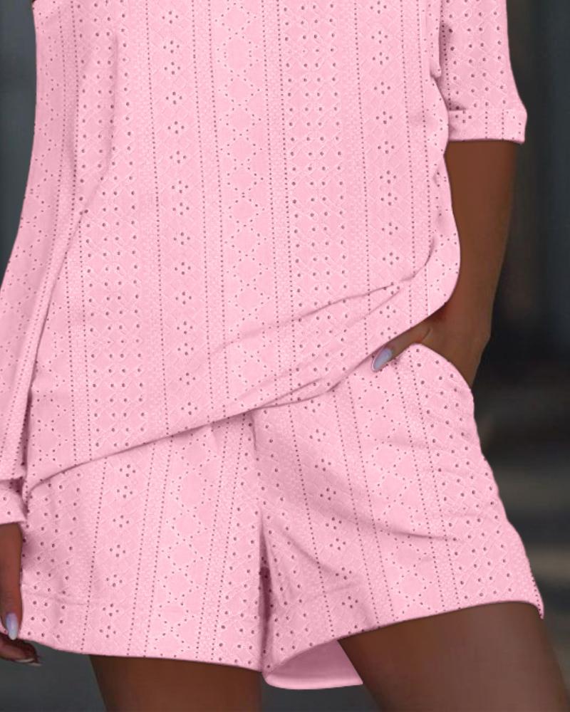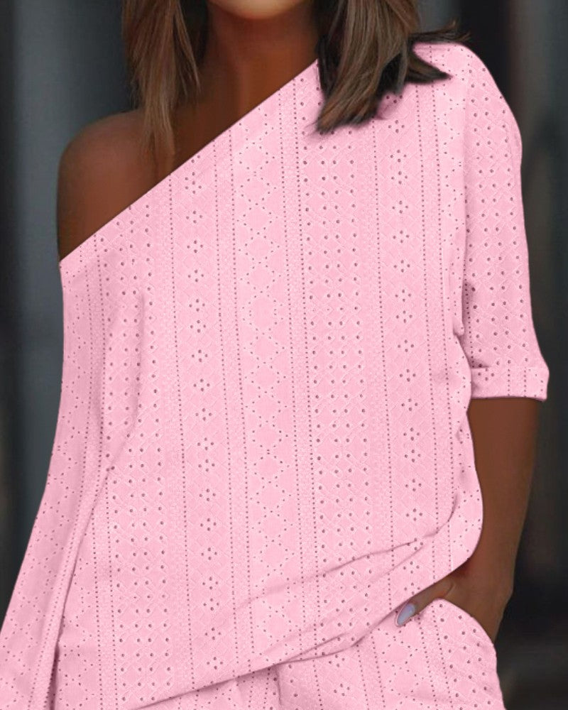 2 Pieces Outfits Jacquard One Shoulder Long Sleeve Top and Casual Strechy Waist Pocket Design Shorts Set