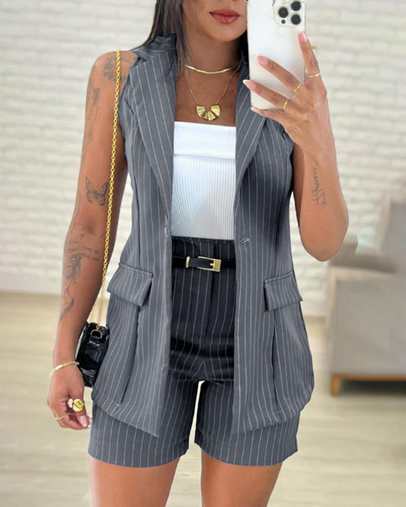 2 Pieces Outfits Striped Print Turn down Collar Pocket Design Vest Blazer and Casual Shorts Set