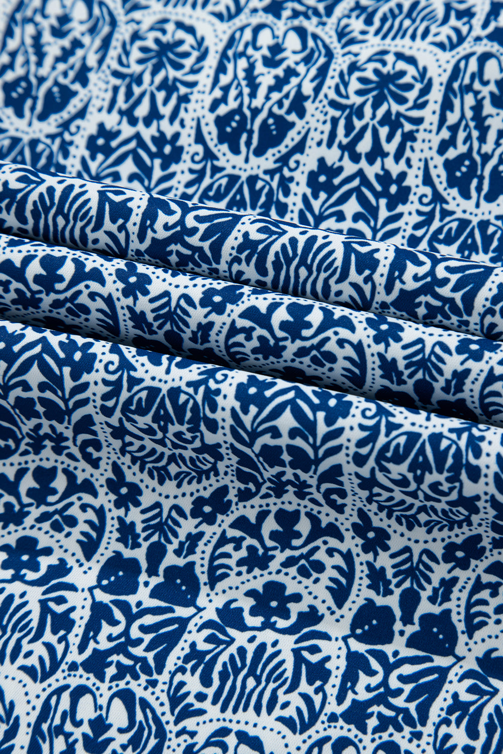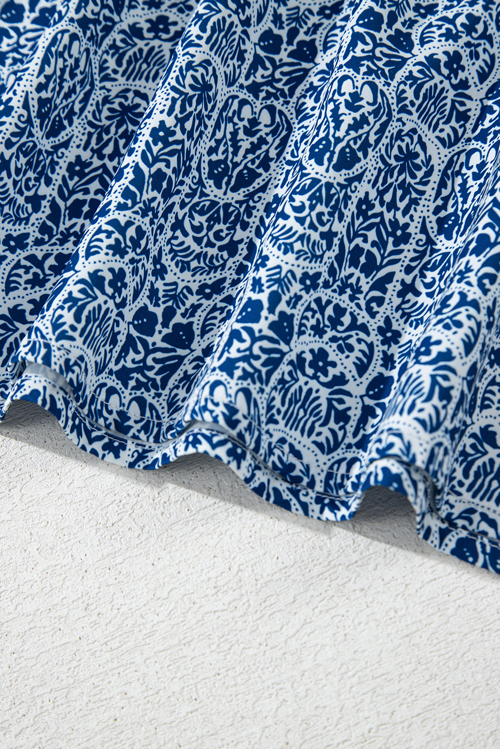 Blue Floral Striped Print Contrast Ric-rac Puff Sleeve Top