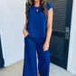 Sky Blue Textured Knit Cap Sleeve T Shirt and Wide Leg Pants Set