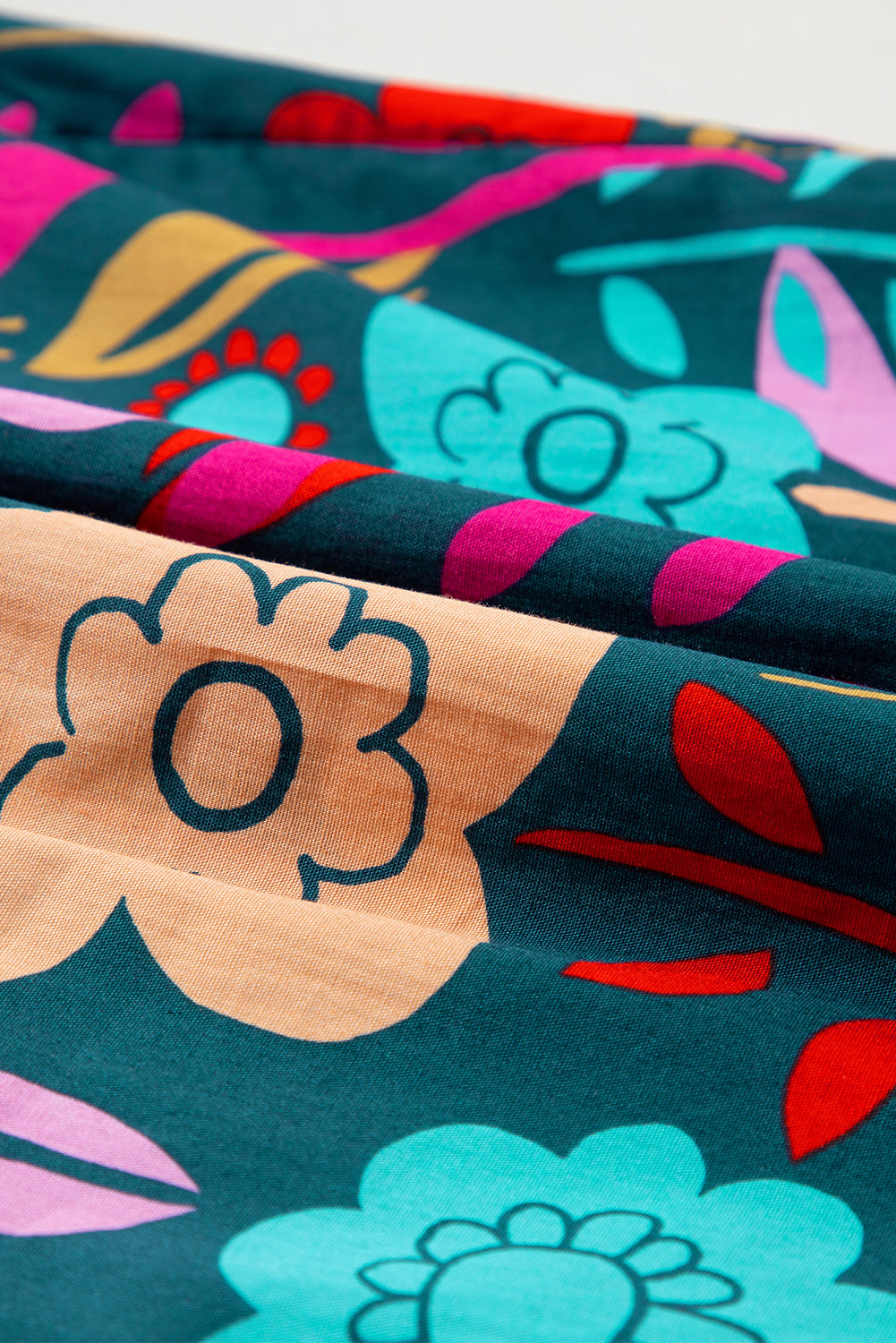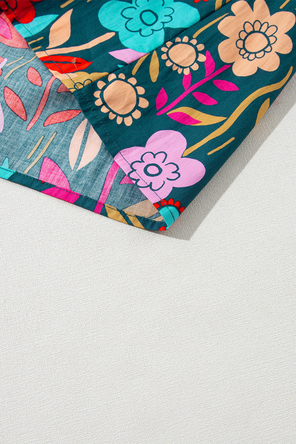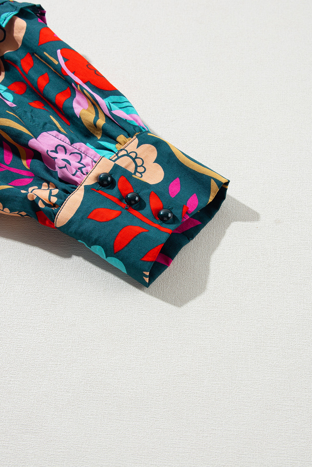 Green Floral Knot Split Neck Puff Sleeve Blouse