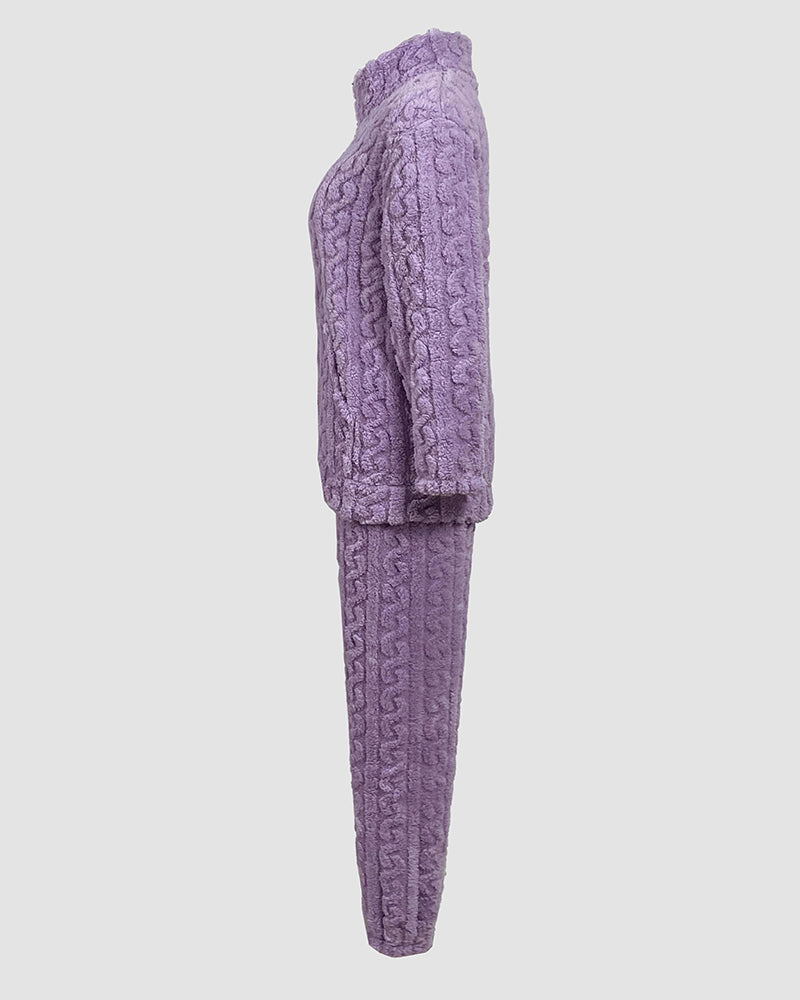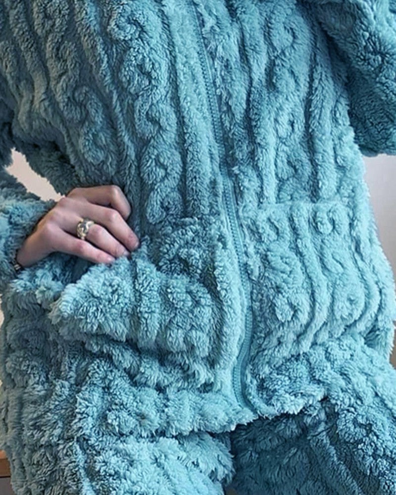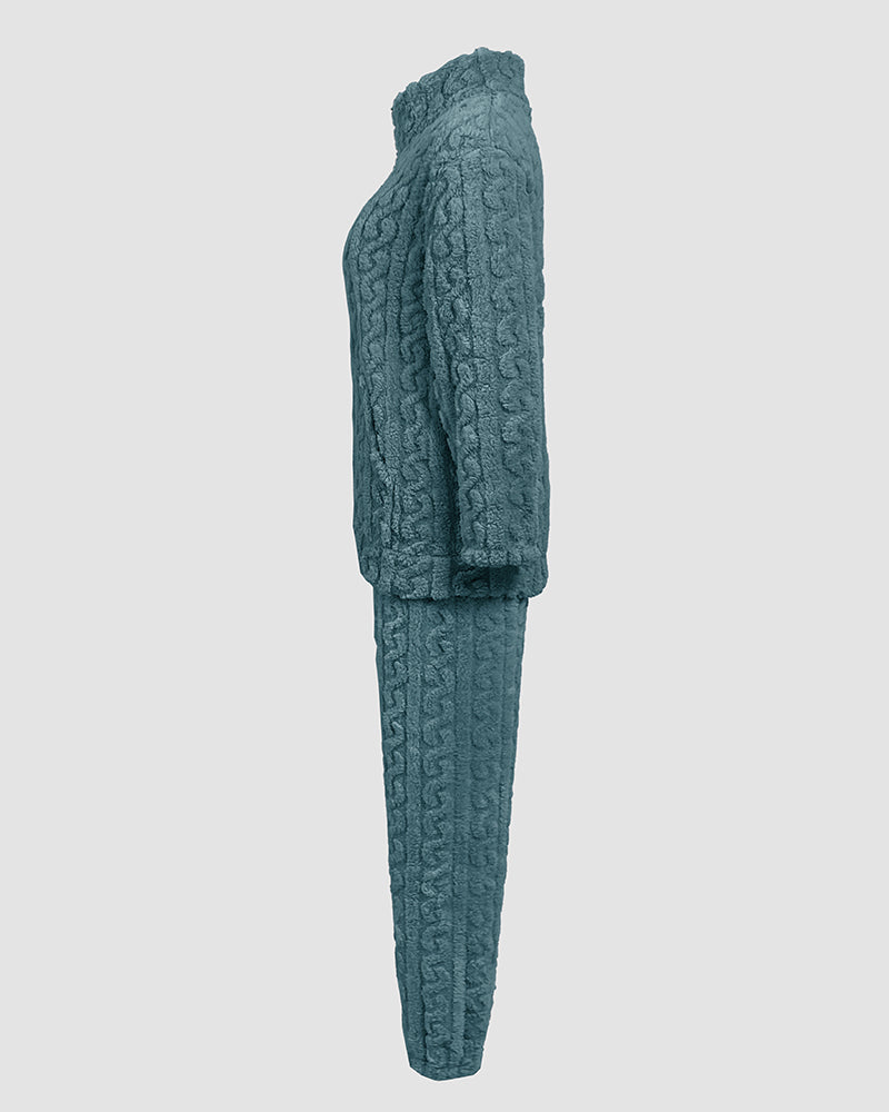 2PCS Jacquard Textured Stand Collar Zip Up Fuzzy Teddy Top & Pants Set