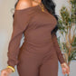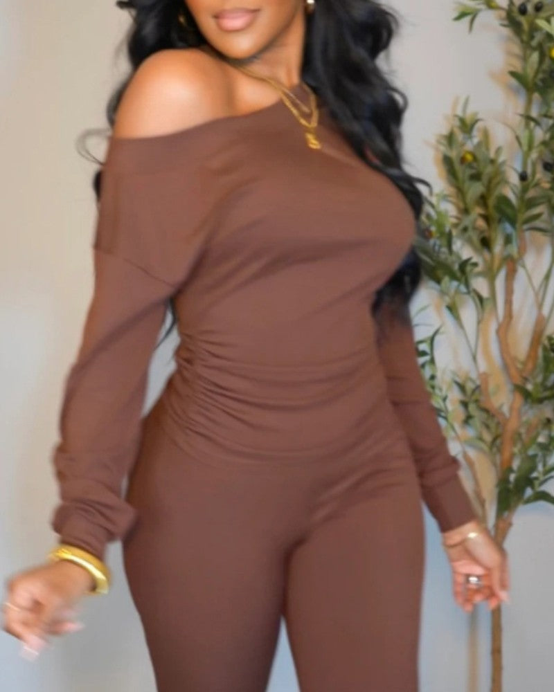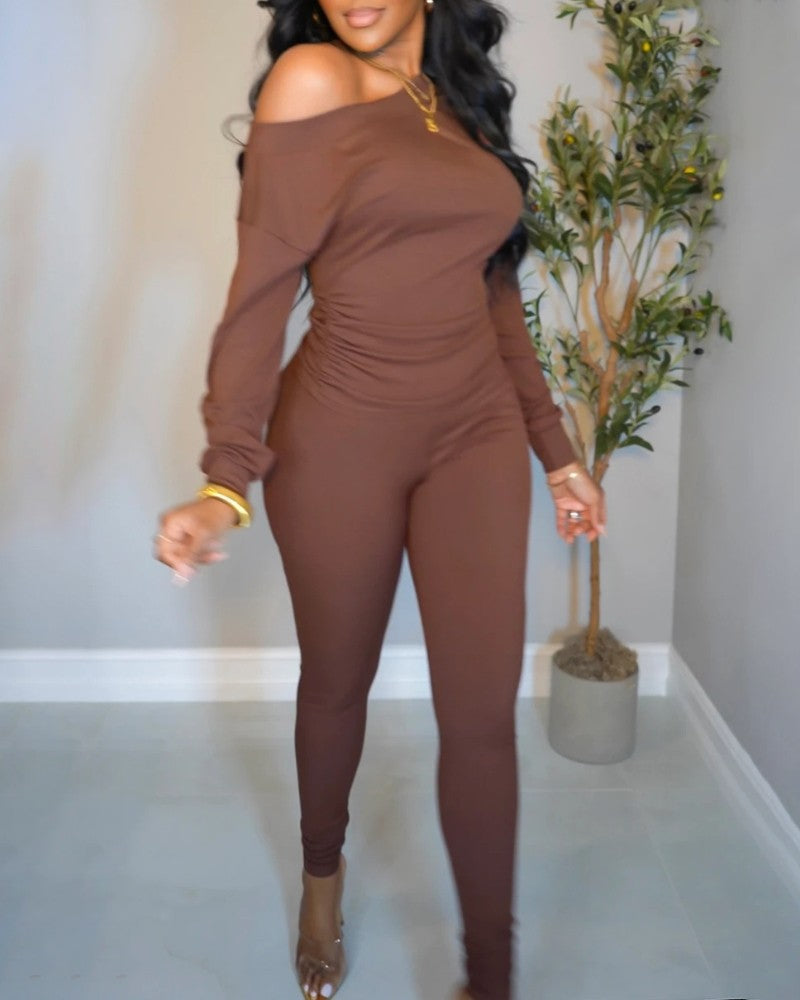2PCS Skew Neck Ruched Waist Top & Pants Set