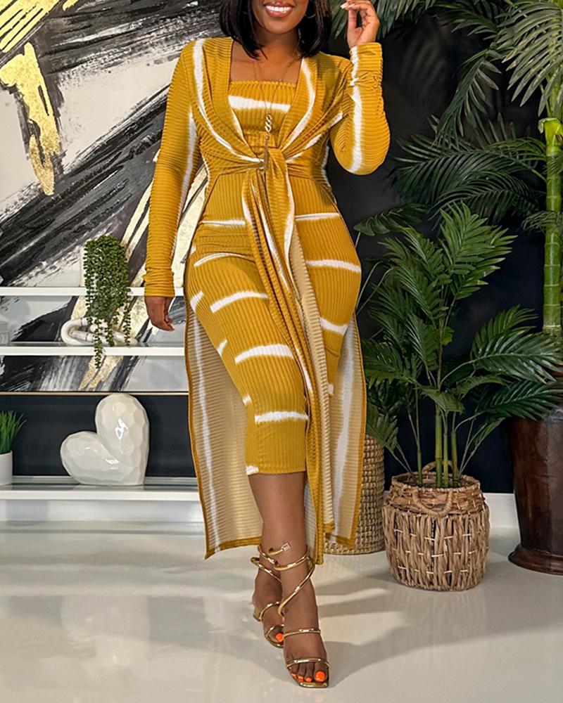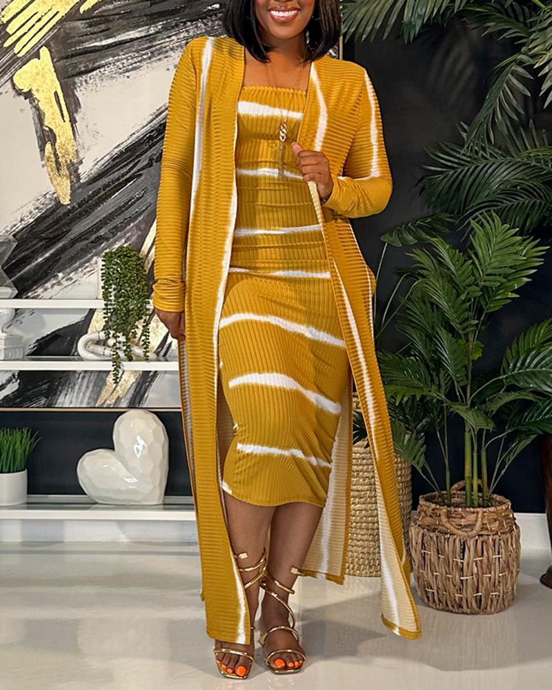 2PCS Tie Dye Print Striped Ribbed Bodycon Dress & Longline Side Slit Cardigan Coat Set