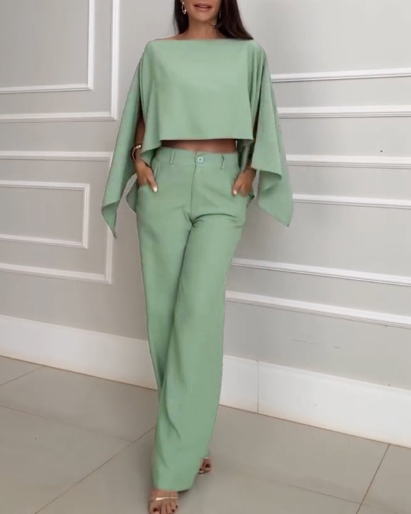 3 Pieces Outfit Cold Shoulder Slit Cloak Sleeve Asymmetrical Hem Convertible Top and Casual Zipper Fly Elastic Back Waist Pants Set With Bandeau