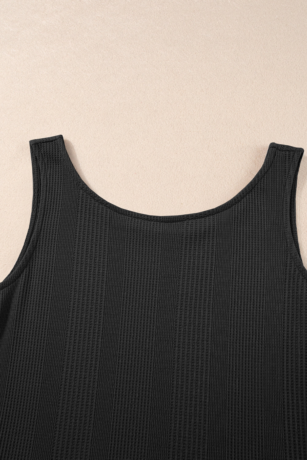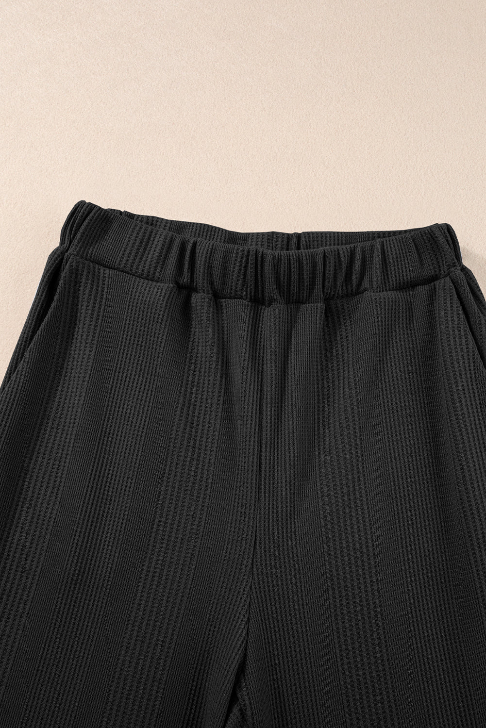Black Solid Color Ribbed Ruffle Tank Top and Pants Set