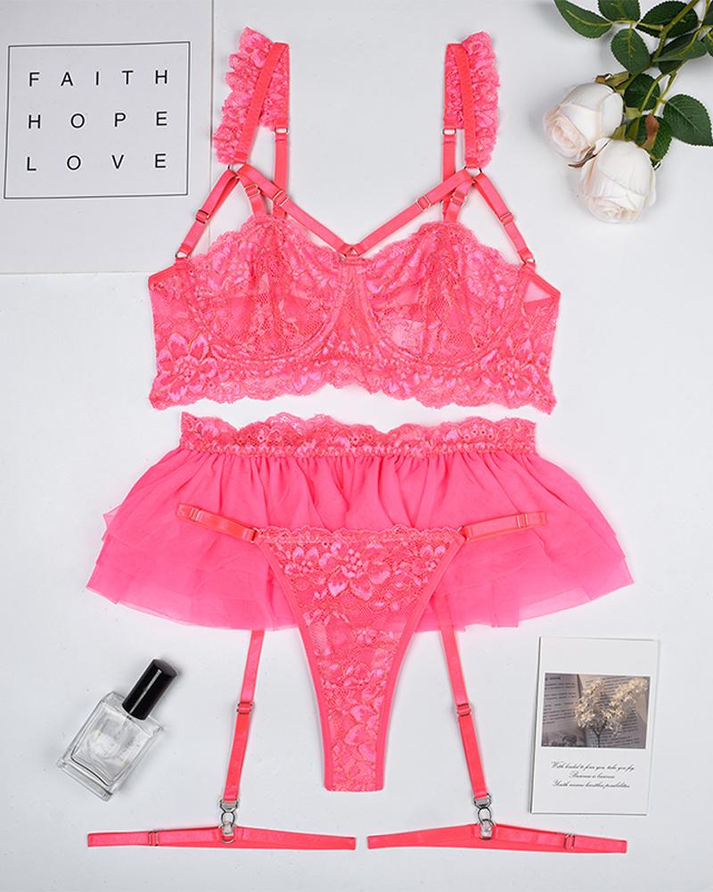 3PCS Crochet Lace Layered Ruffles Garter Lingerie Set
