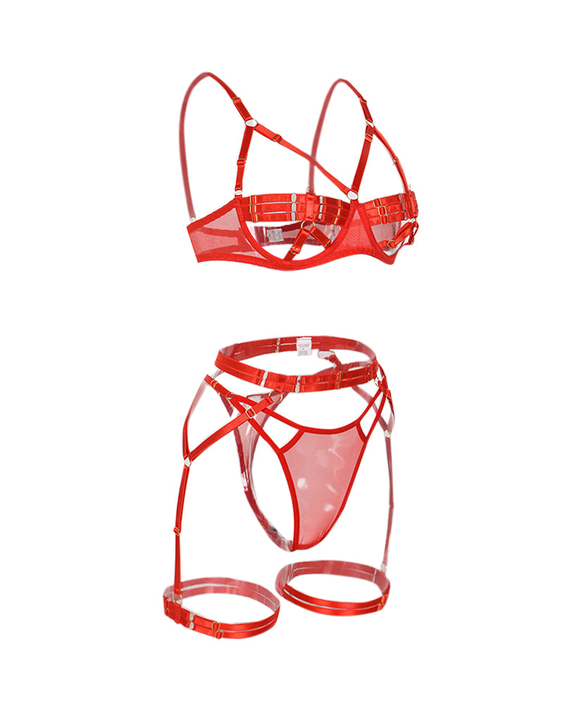3PCS Hollow Out Sheer Mesh Garter Lingerie Set