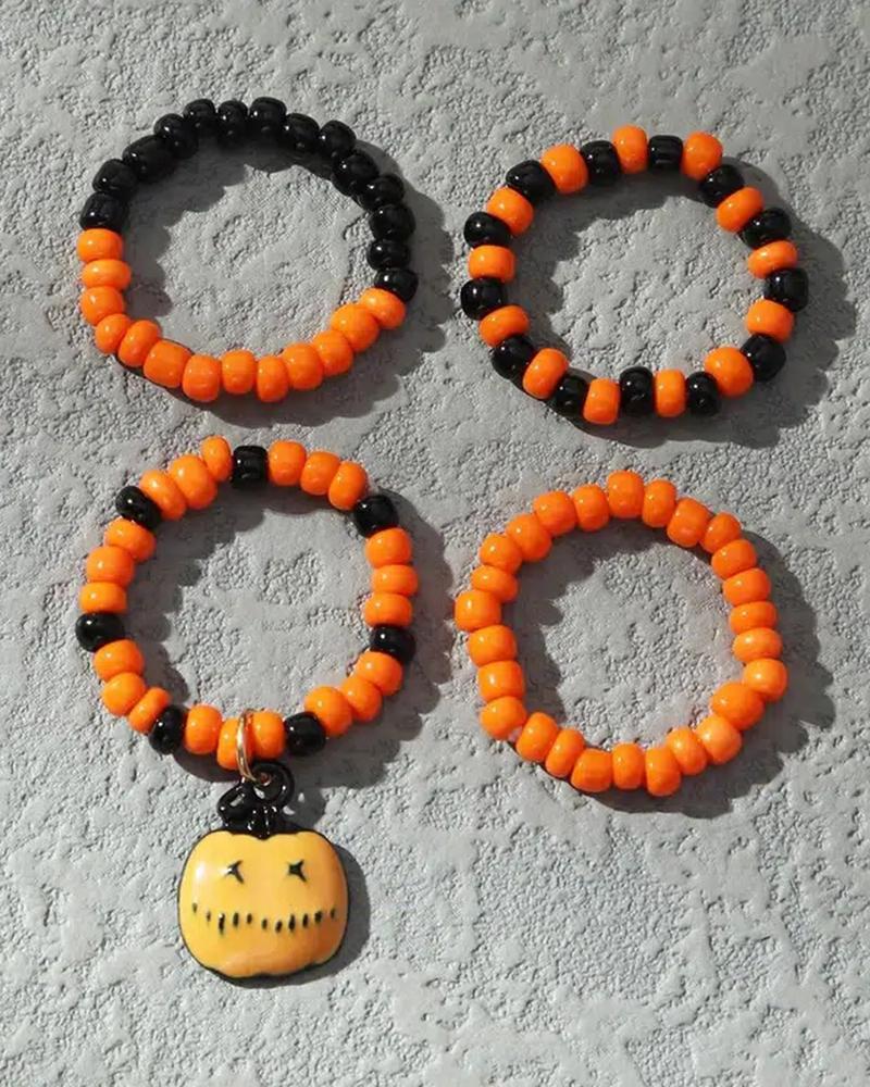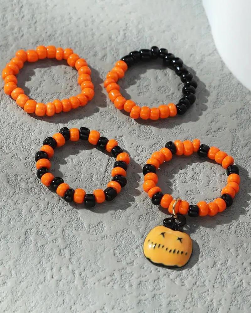 4pcs Halloween Beaded Pumpkin Pattern Ring Set