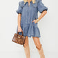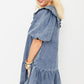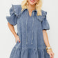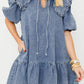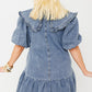 Dusk Blue Ruffled Collared Side Pockets Puff Sleeve Denim Mini Dress