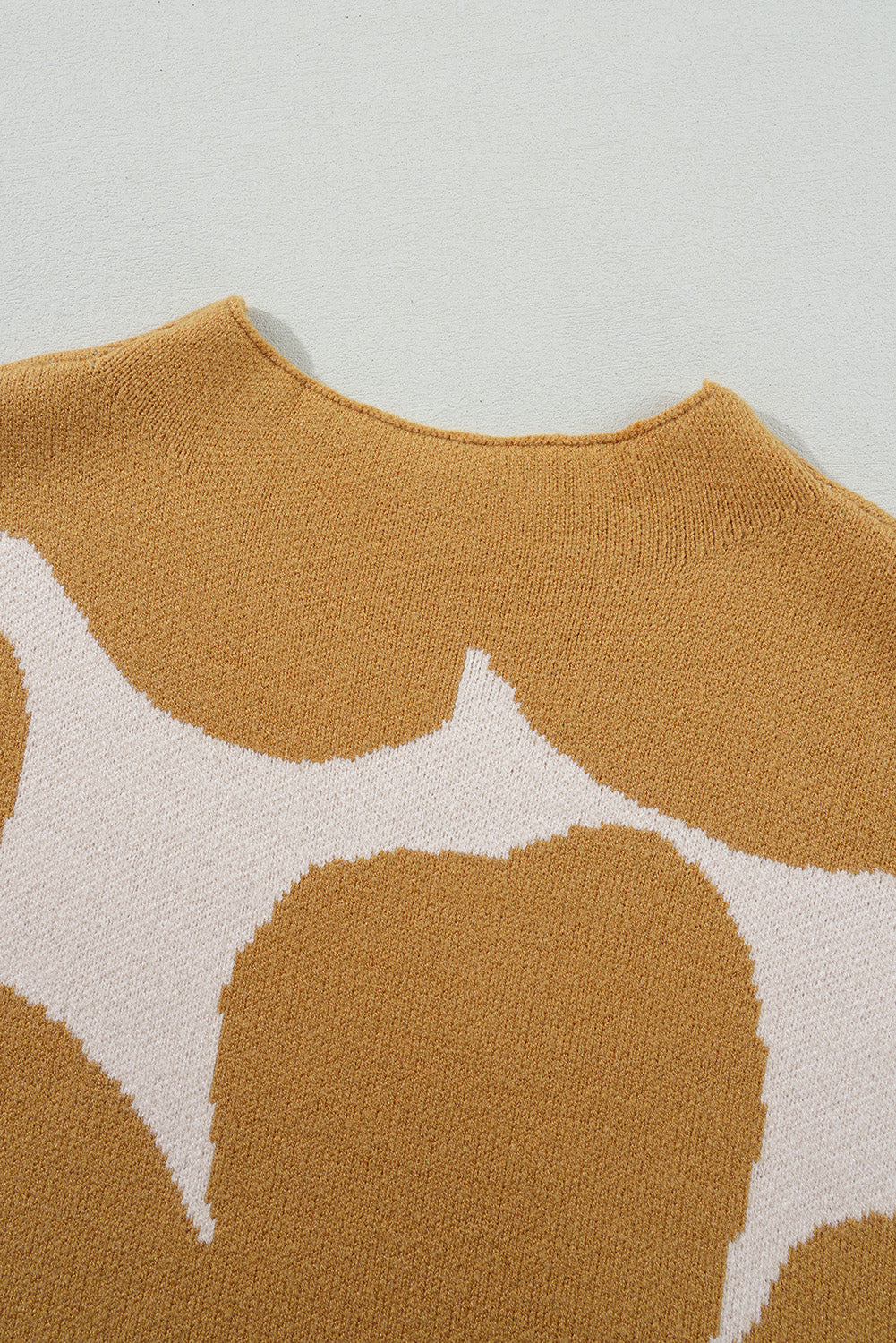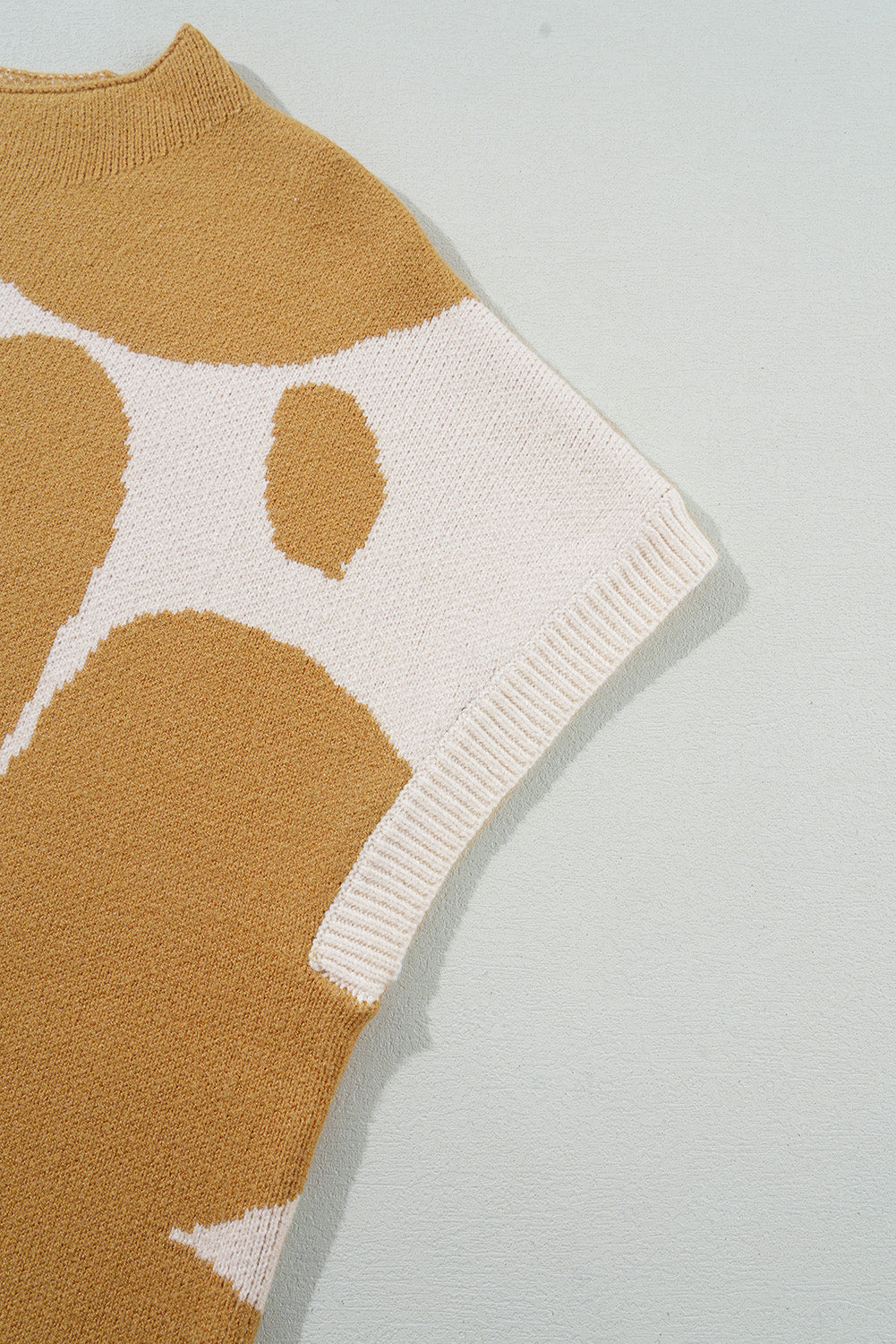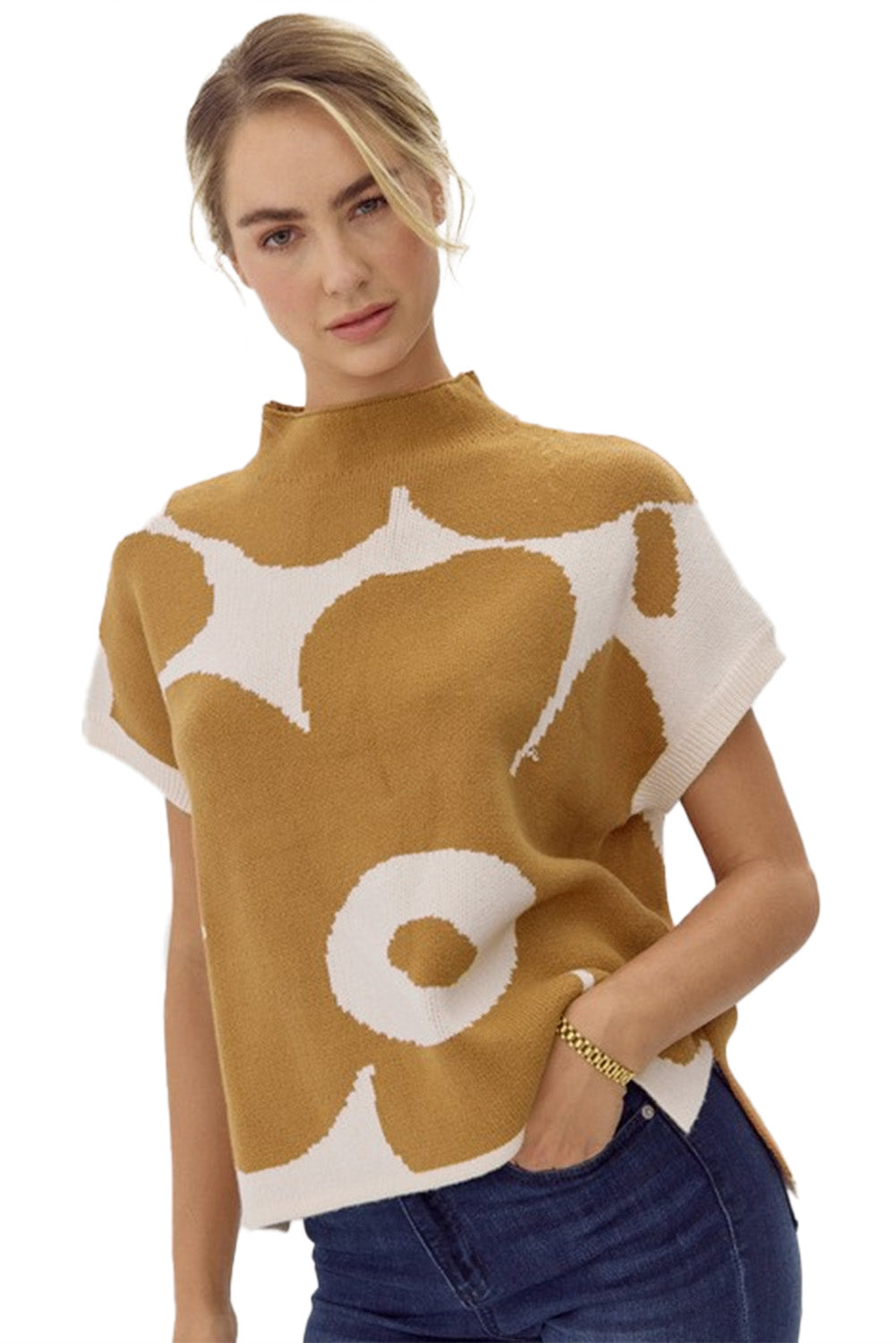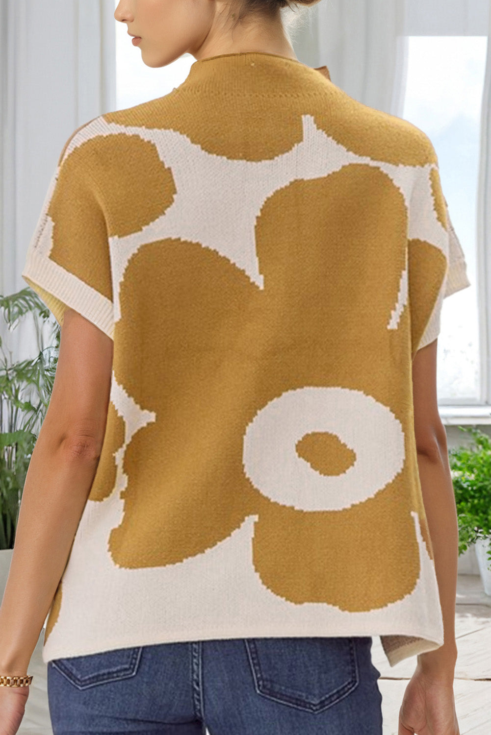 Camel Big Flower Pattern Stand Neck Short Sleeve Sweater
