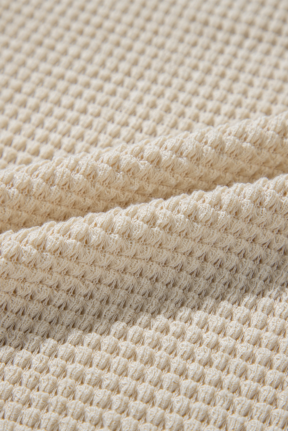 Beige Waffle Floral Patchwork Short Flounce Sleeve Peplum Blouse
