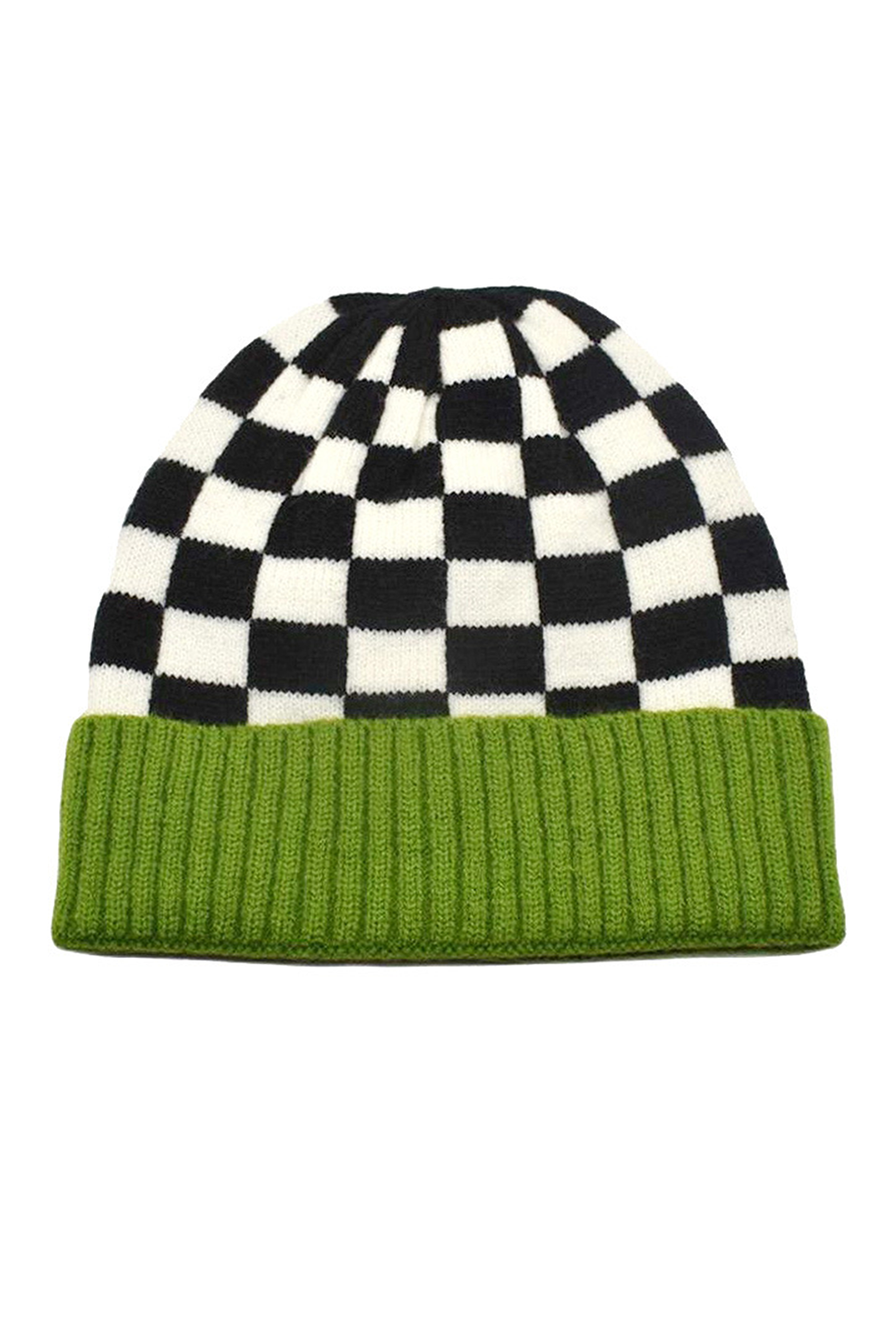 Spinach Green Checkered Color Block Unisex Winter Beanie Hat
