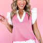 Pink Contrast V Neck Ruffled Textured Knit Top