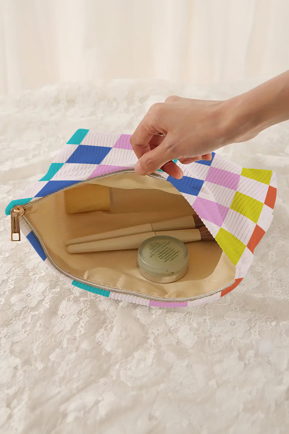 Pink Color Block Checkered Zipper Corduroy Cosmetic Bag