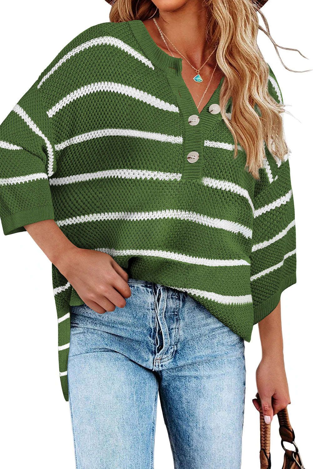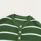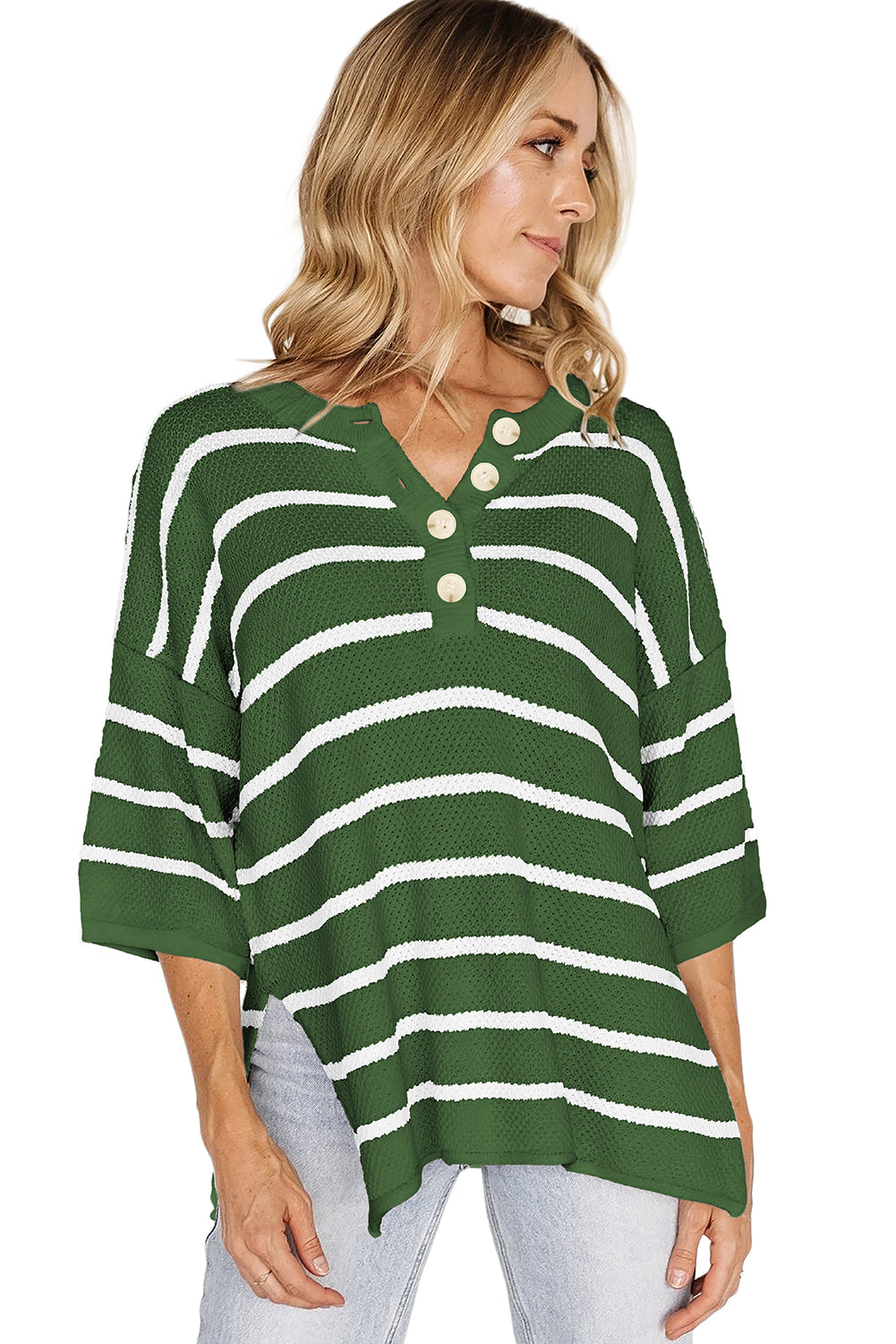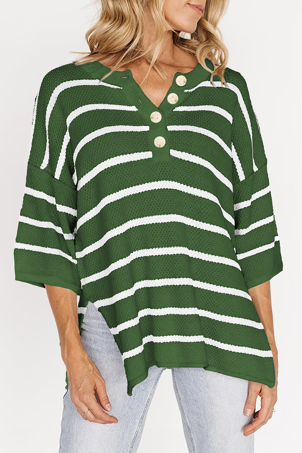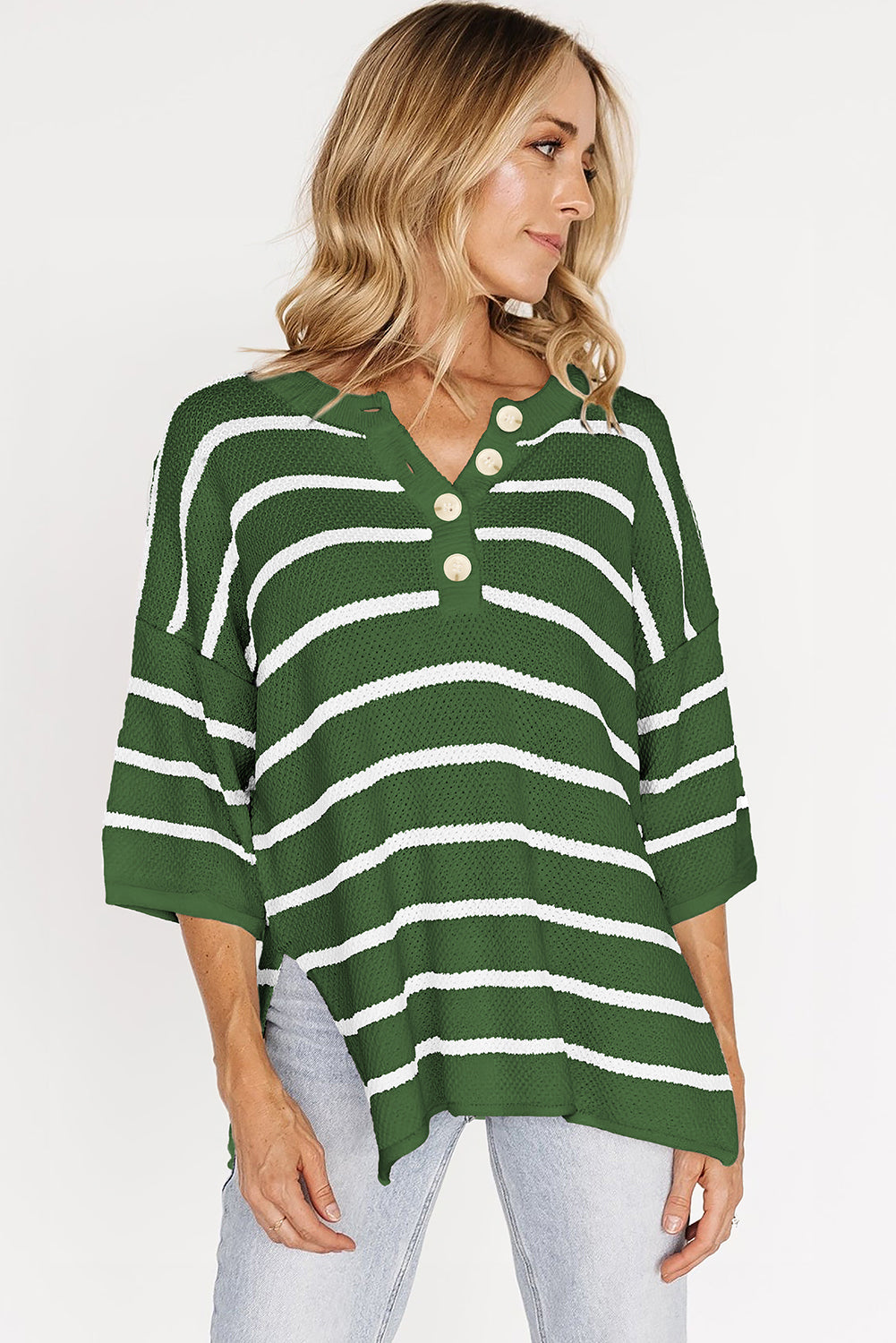 Green Stripe Henley Buttoned Placket Drop Shoulder Bracelet Sleeve Knit Sweater Tee