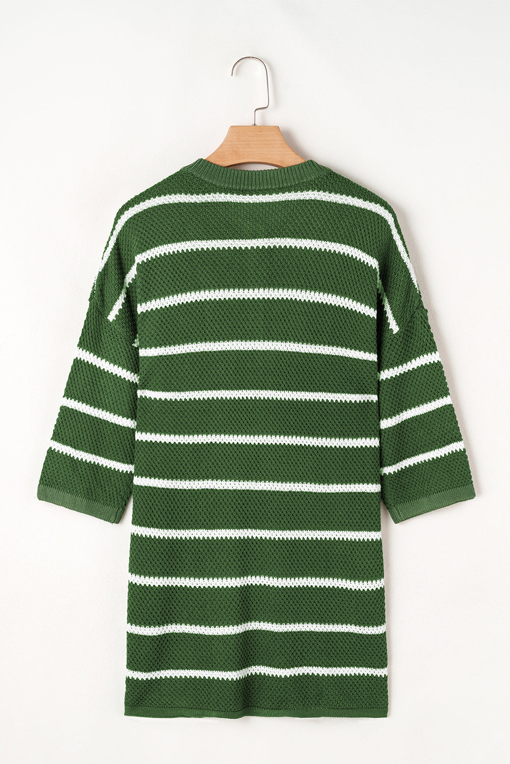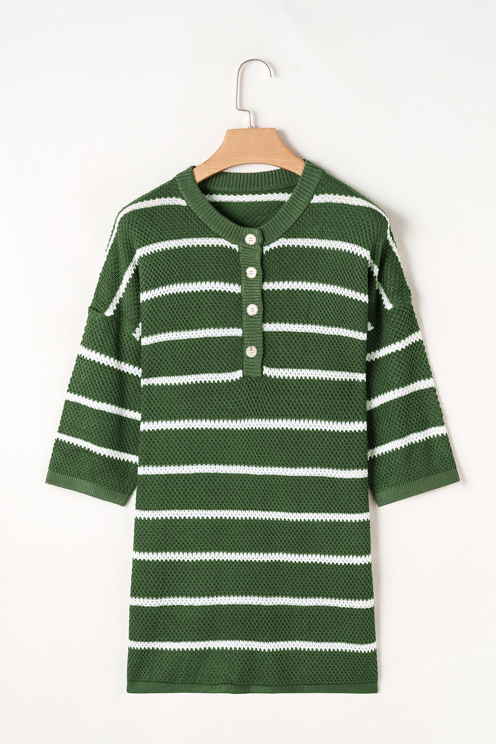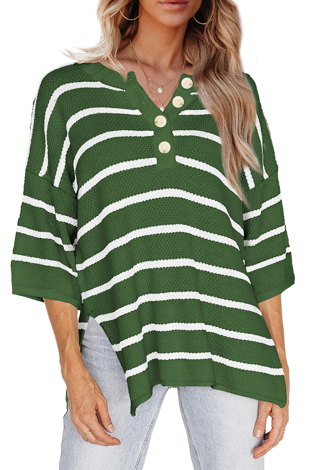 Green Stripe Henley Buttoned Placket Drop Shoulder Bracelet Sleeve Knit Sweater Tee