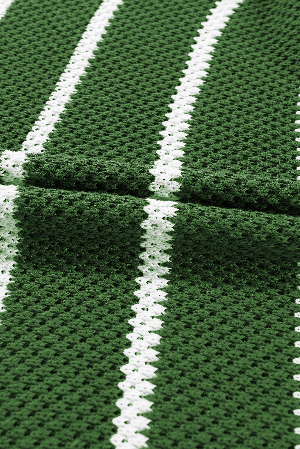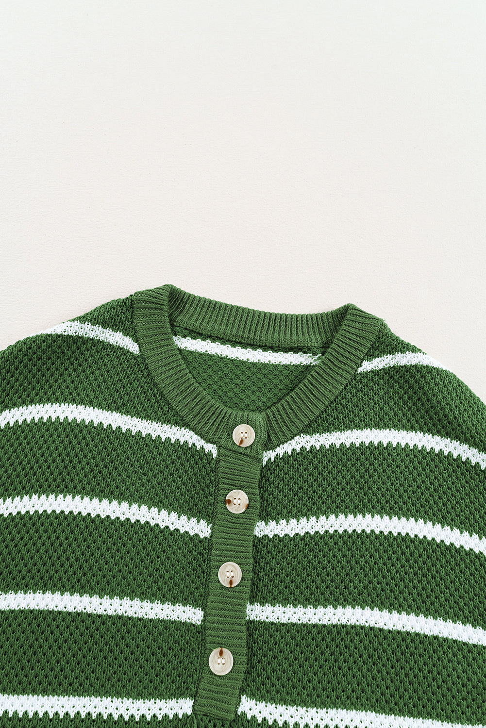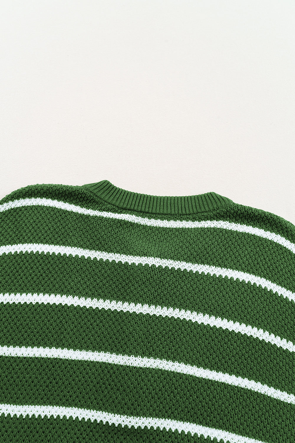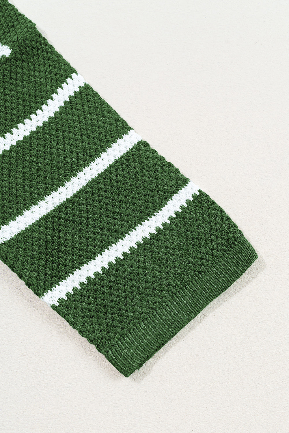 Green Stripe Henley Buttoned Placket Drop Shoulder Bracelet Sleeve Knit Sweater Tee