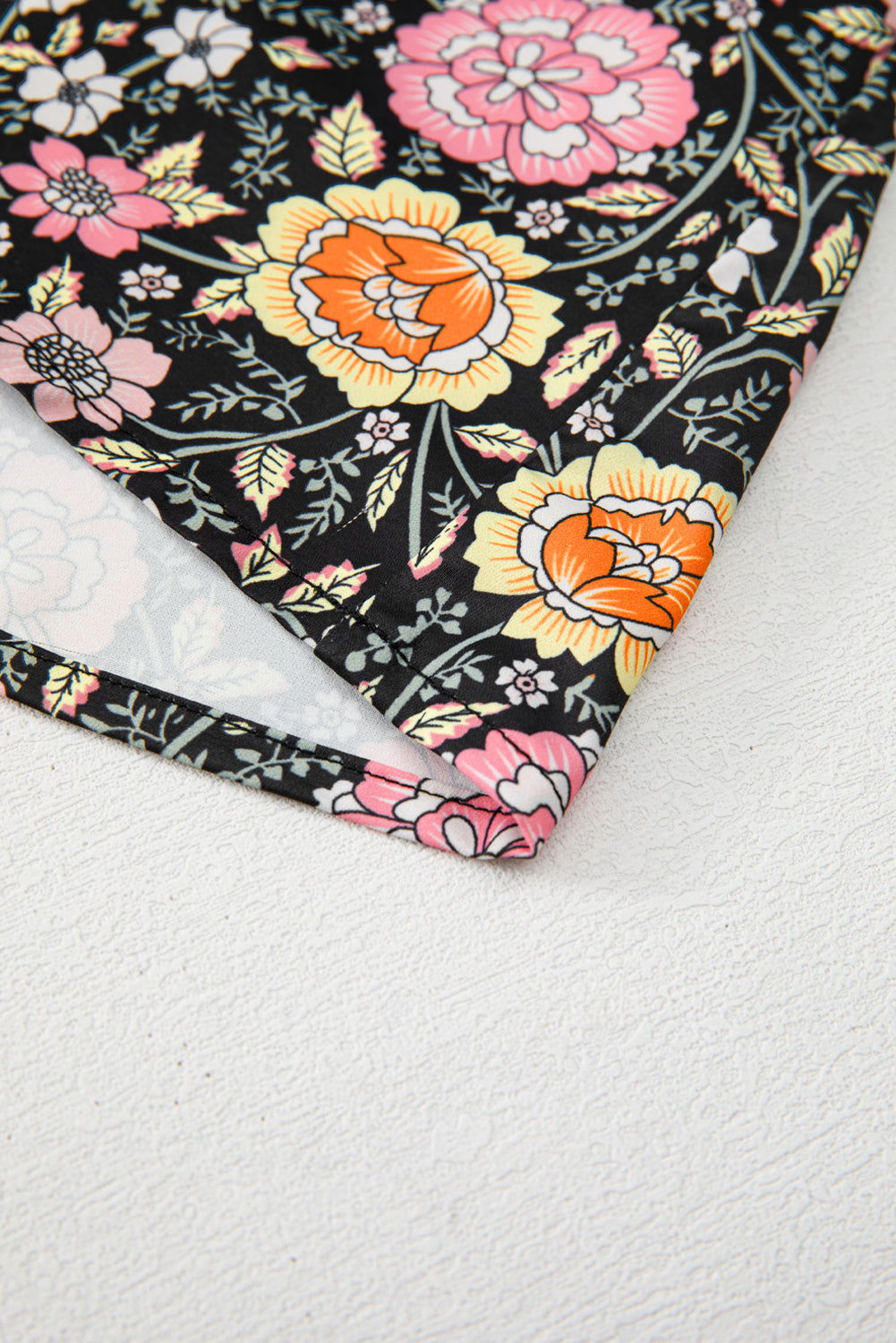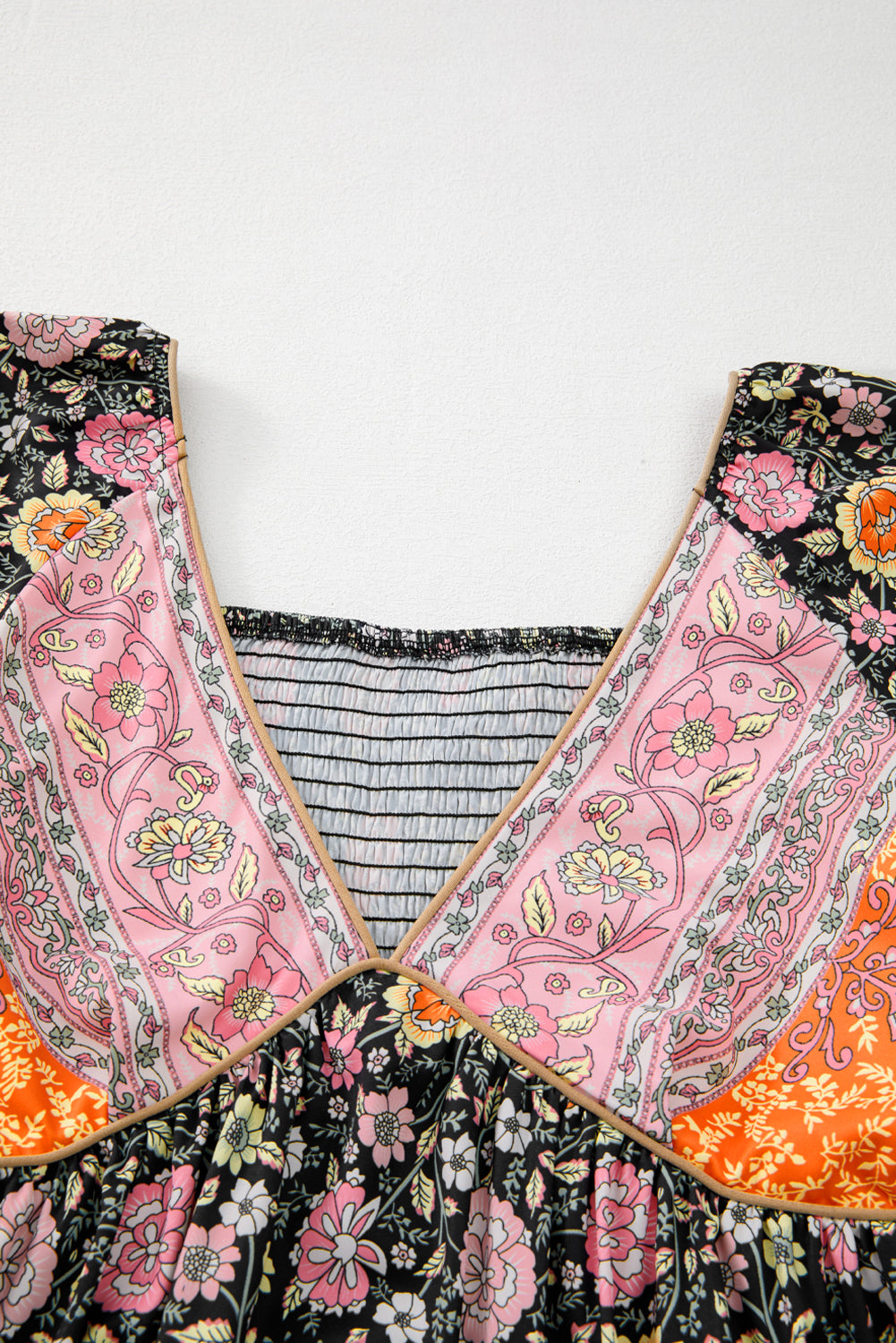 Black Boho Floral Patchwork Sexy V Neck Short Sleeve Maxi Dress
