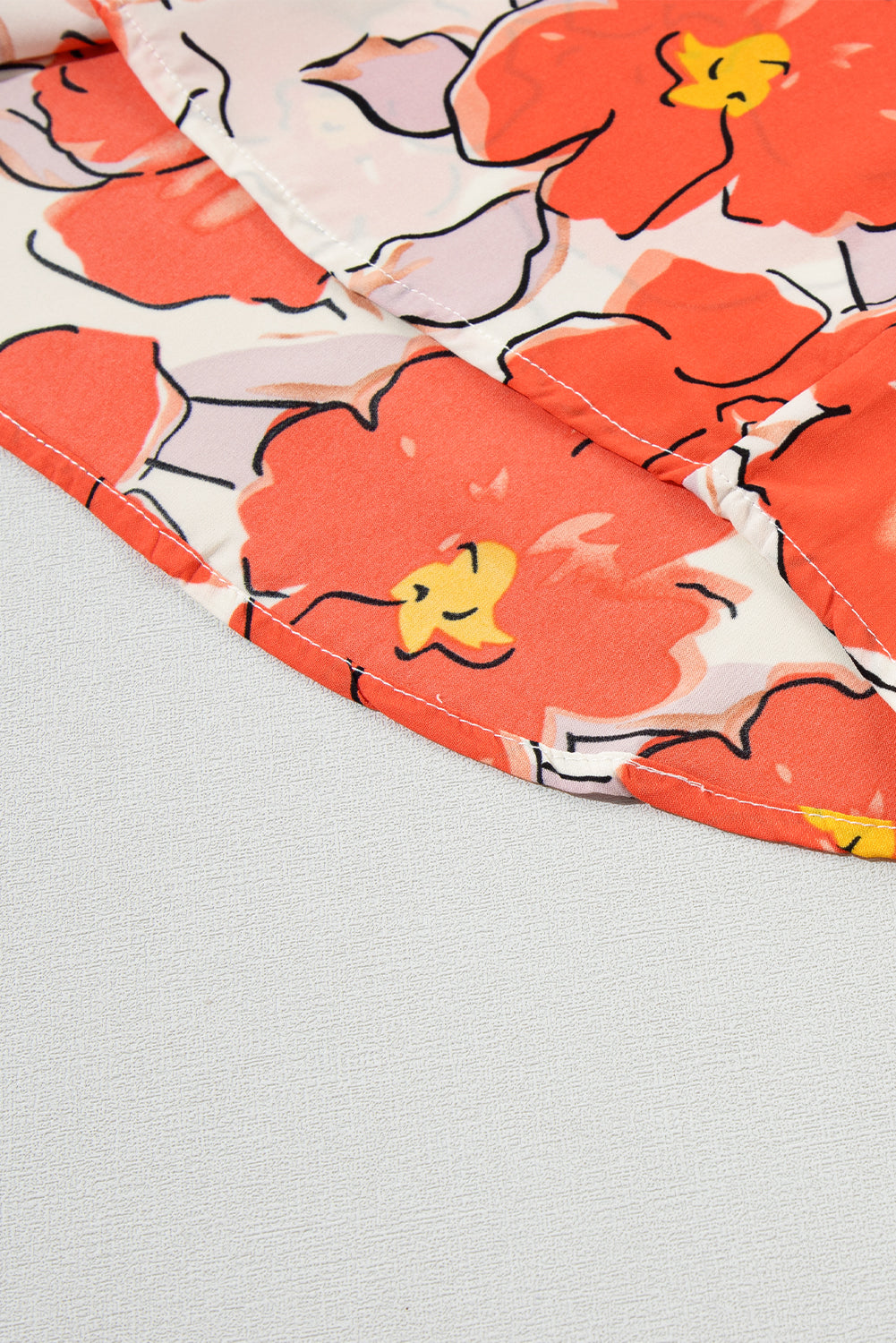 Orange Floral Bubble Sleeve Frill Neck Loose Blouse