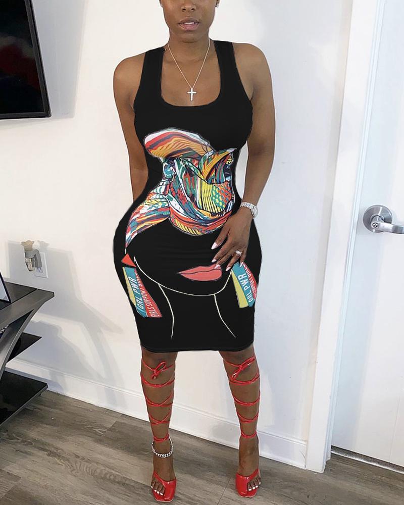Abstract Figure Print U Neck Bodycon Dress