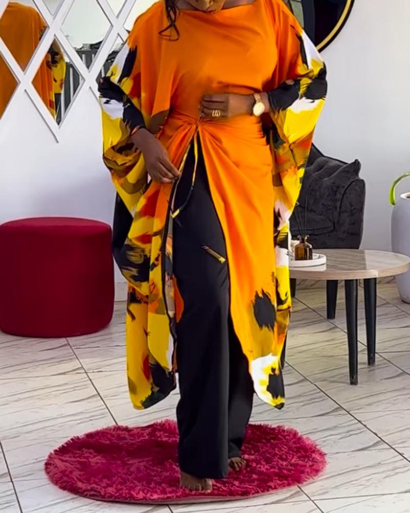Abstract Print Boat Neck Batwing Sleeve Asymmetrical Slit Dress