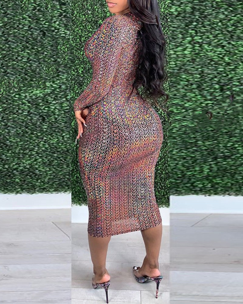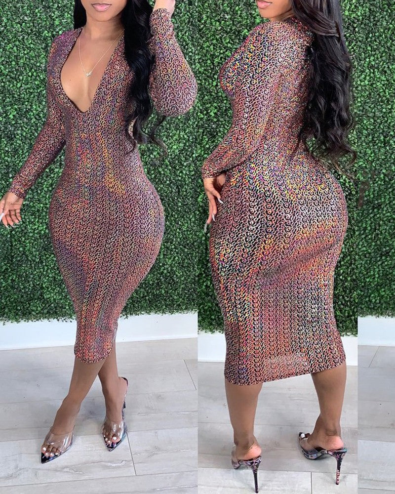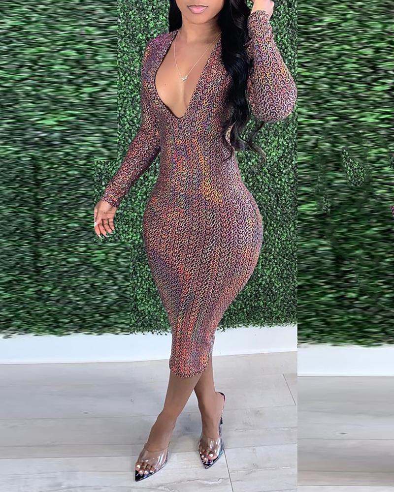 Abstract Print Long Sleeve Plunge Bodycon Dress
