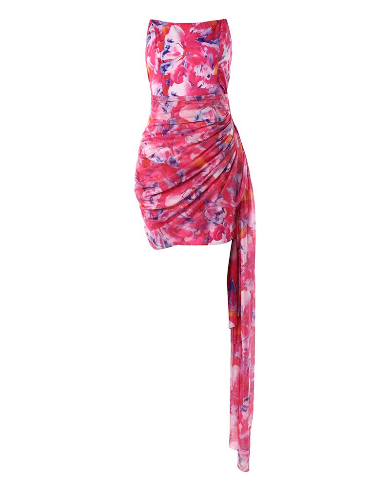Allover Floral Print Bandeau Side Asymmetrical Hem Party Dress